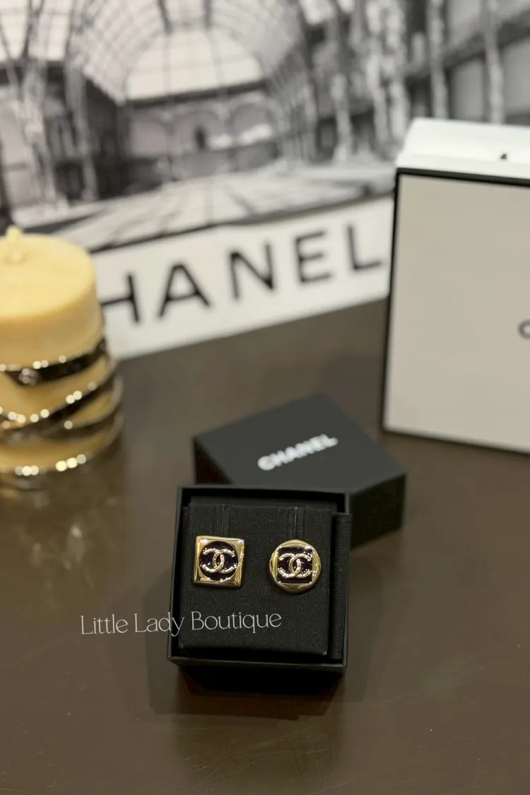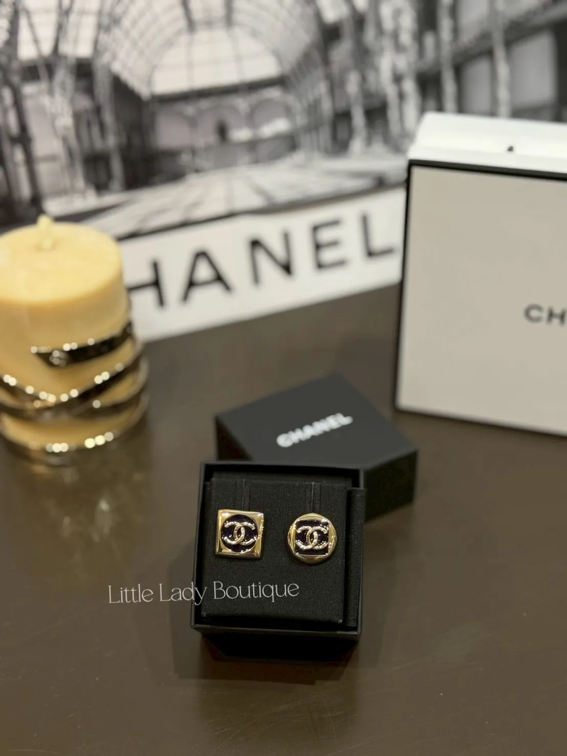 CHANEL 金邊 雙邊不對稱一方一圓 黑底 金雙C字 貼耳針式耳環(方1.7CM/圓1.