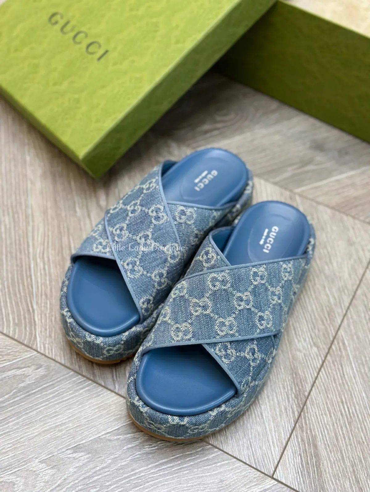 GUCCI 女士 單寧牛仔GG LOGO 交叉帶 厚底拖鞋