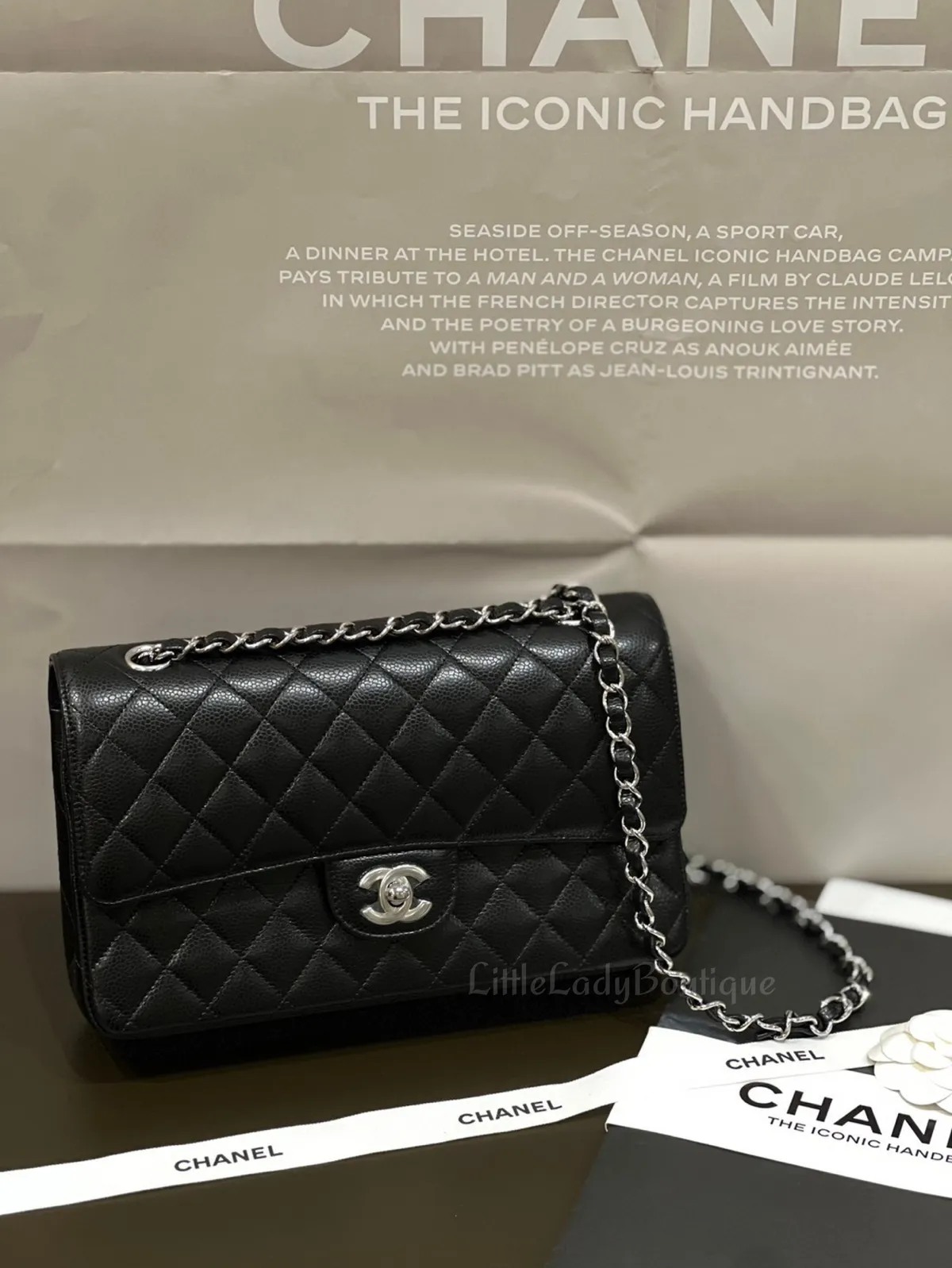 CHANEL 25CM 黑色銀釦荔枝皮菱格紋 掀蓋CF