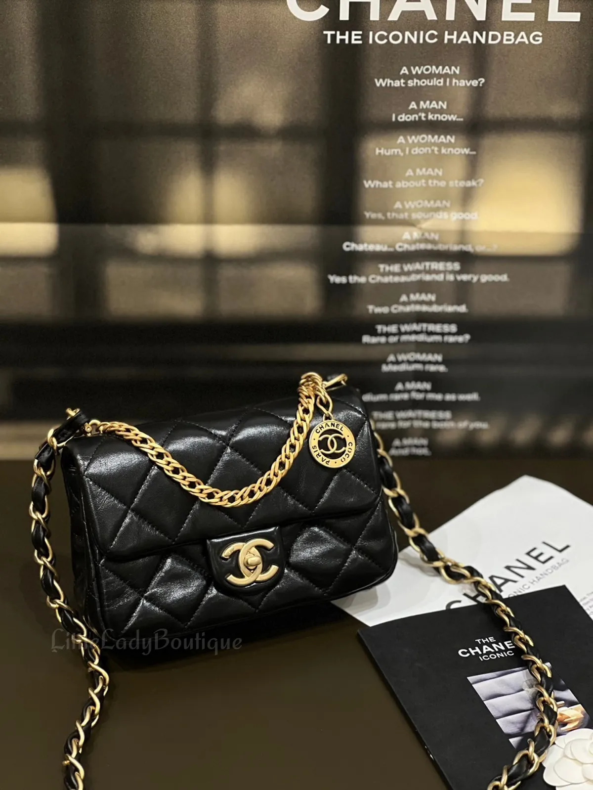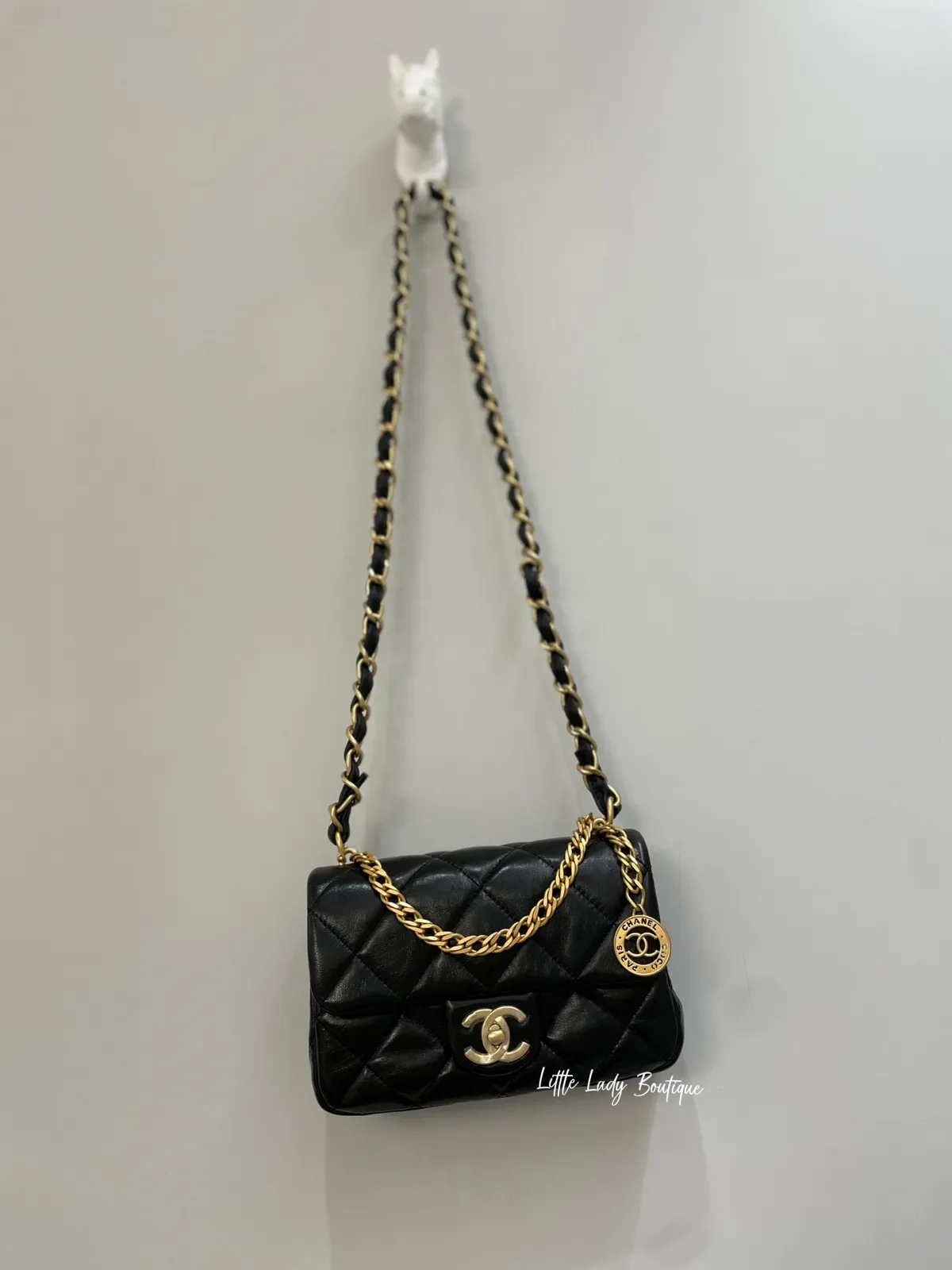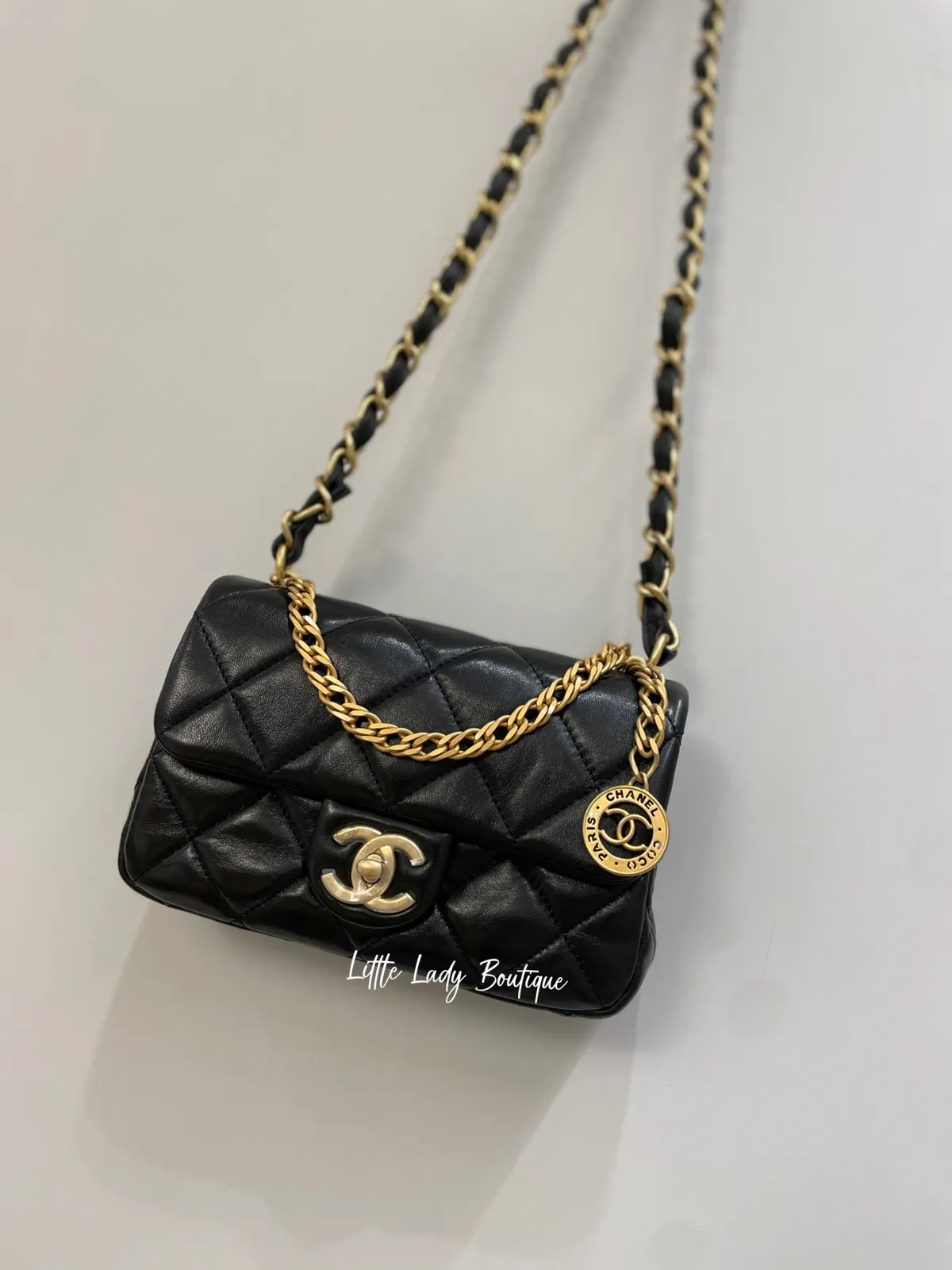 CHANEL MINI 金幣金釦羊皮方胖包 (12 × 21 × 7 cm)