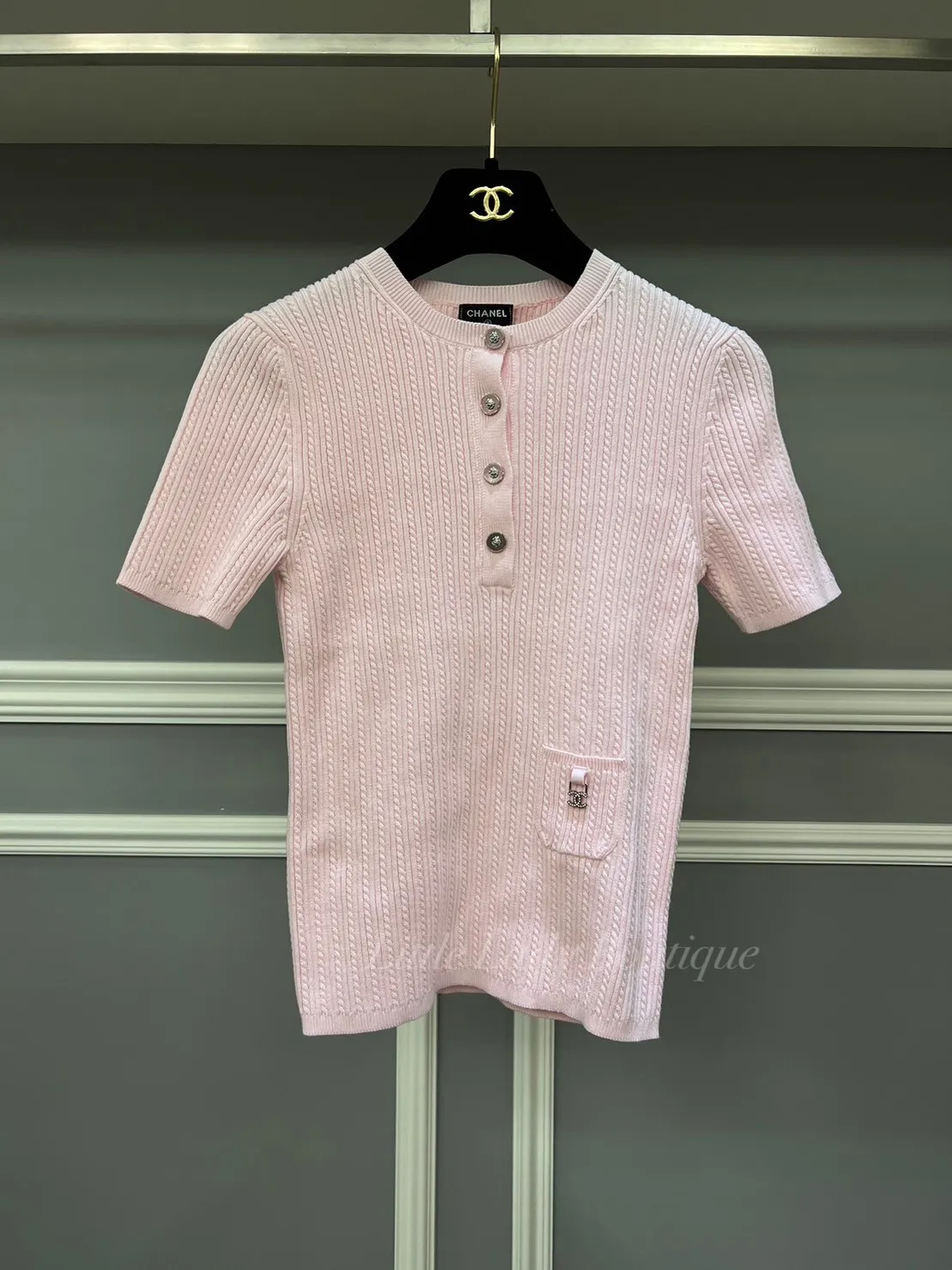 CHANEL 女士 亮粉色 扣子 一口袋 短袖針織上衣