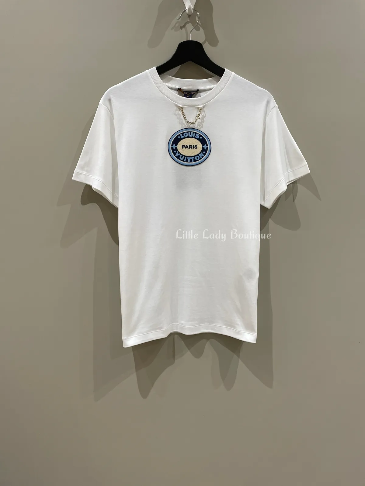 LV 女士 白底 橢圓LV PARIS貼飾 金鍊造型 短袖上衣 (100%棉)