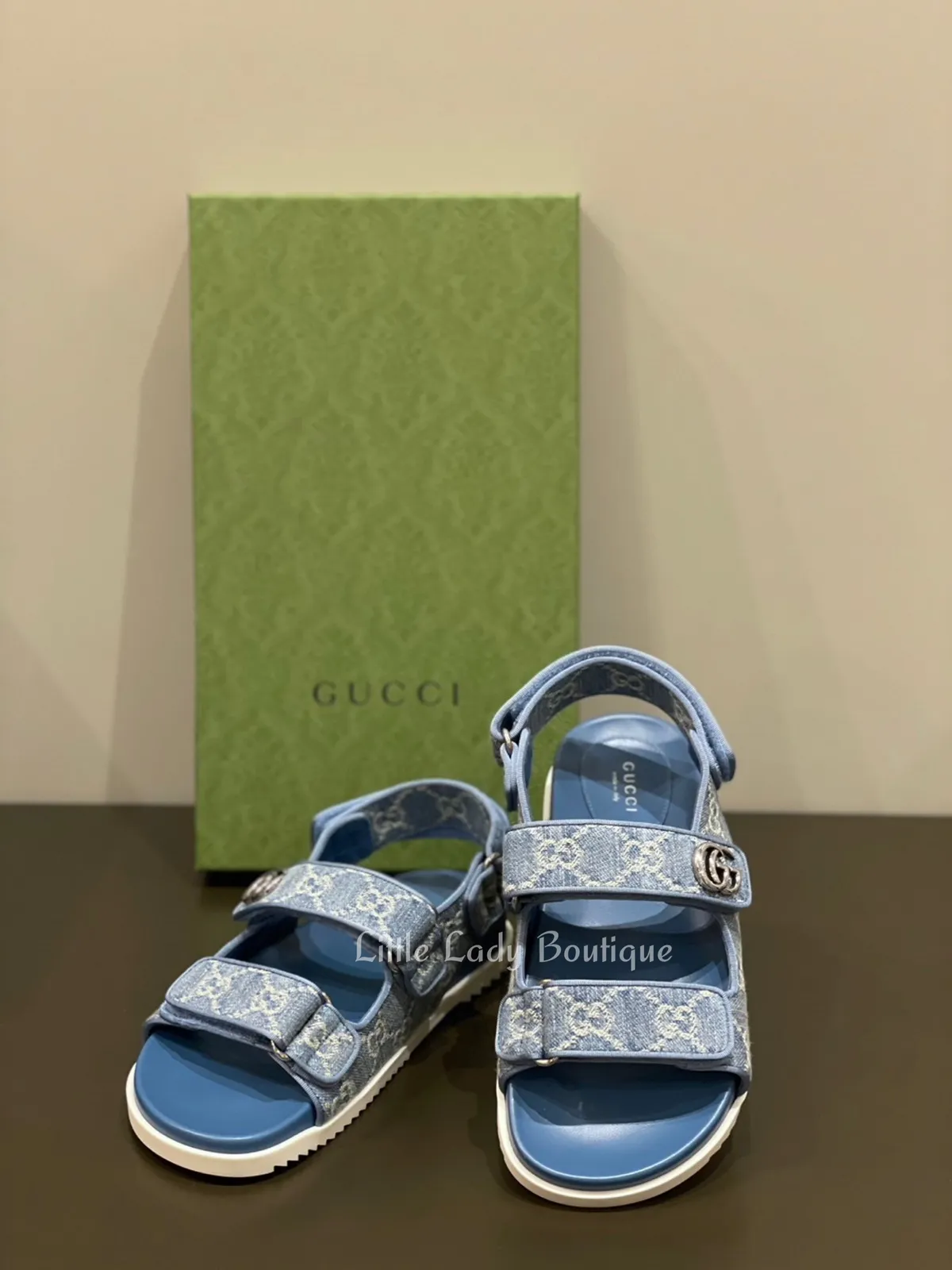 GUCCI 女士 藍色丹寧GG 雙帶魔鬼氈 涼鞋