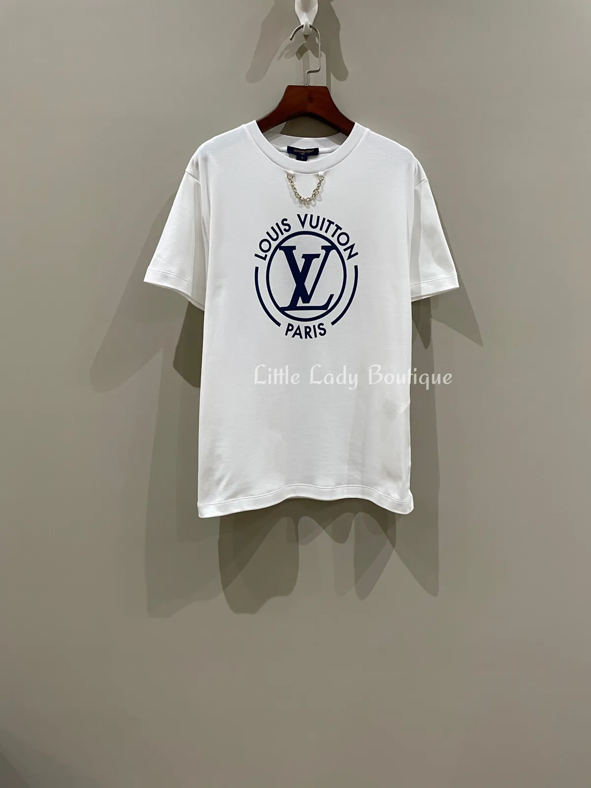 LV 女士 白底 藍色圓圈LV LOGO 金鍊造型 短袖上衣 (100%棉)