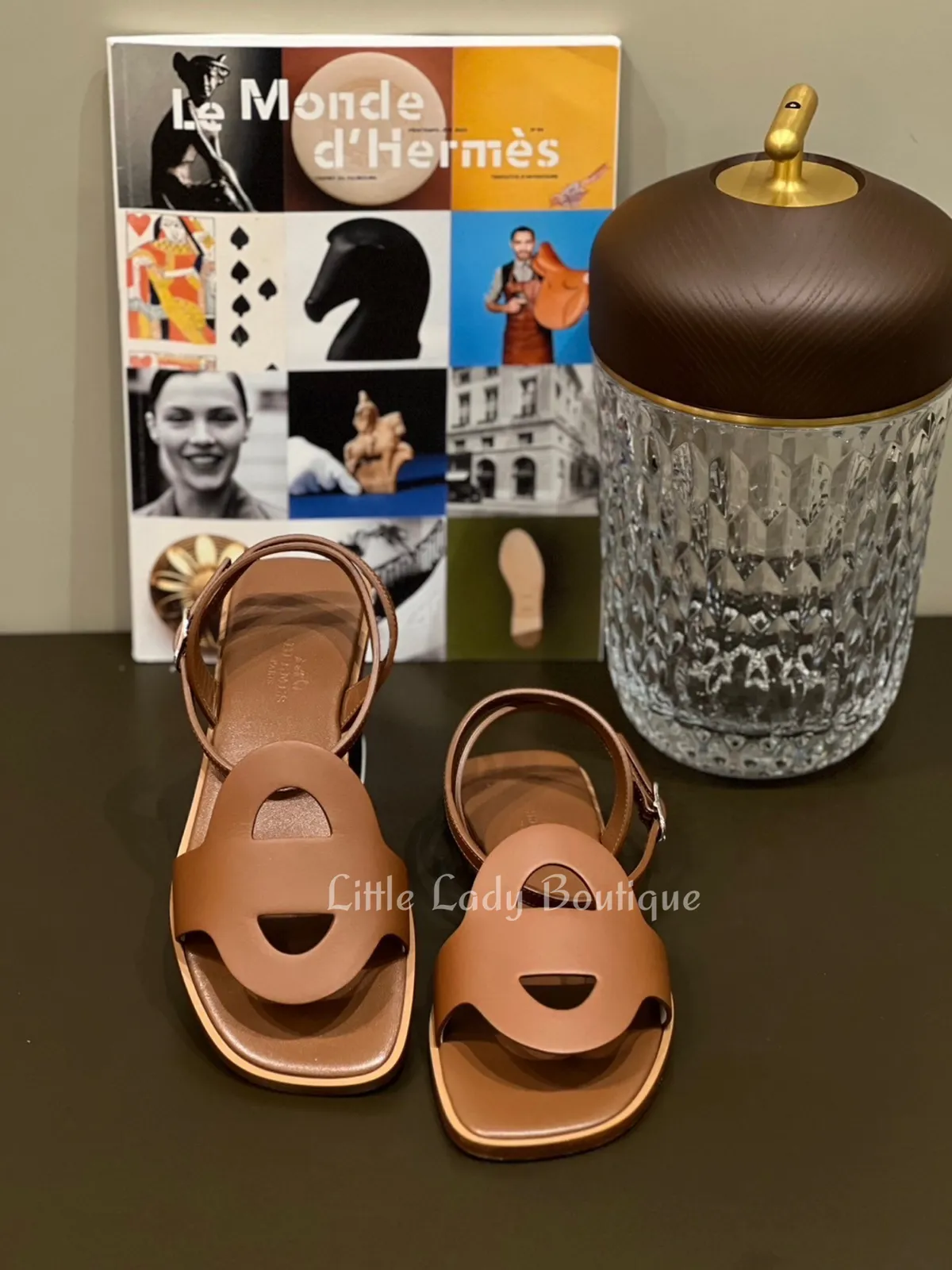 HERMES 女士 JULIE 焦糖色 豬鼻簍空 踝帶 平底涼鞋