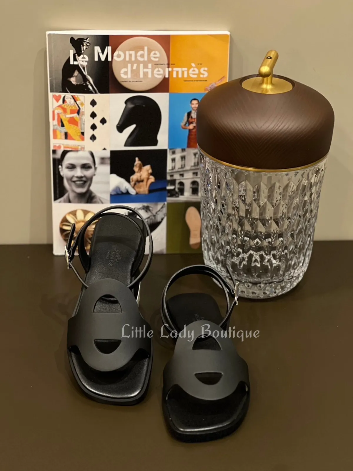 HERMES 女士 JULIE 黑色 豬鼻簍空 踝帶 平底涼鞋