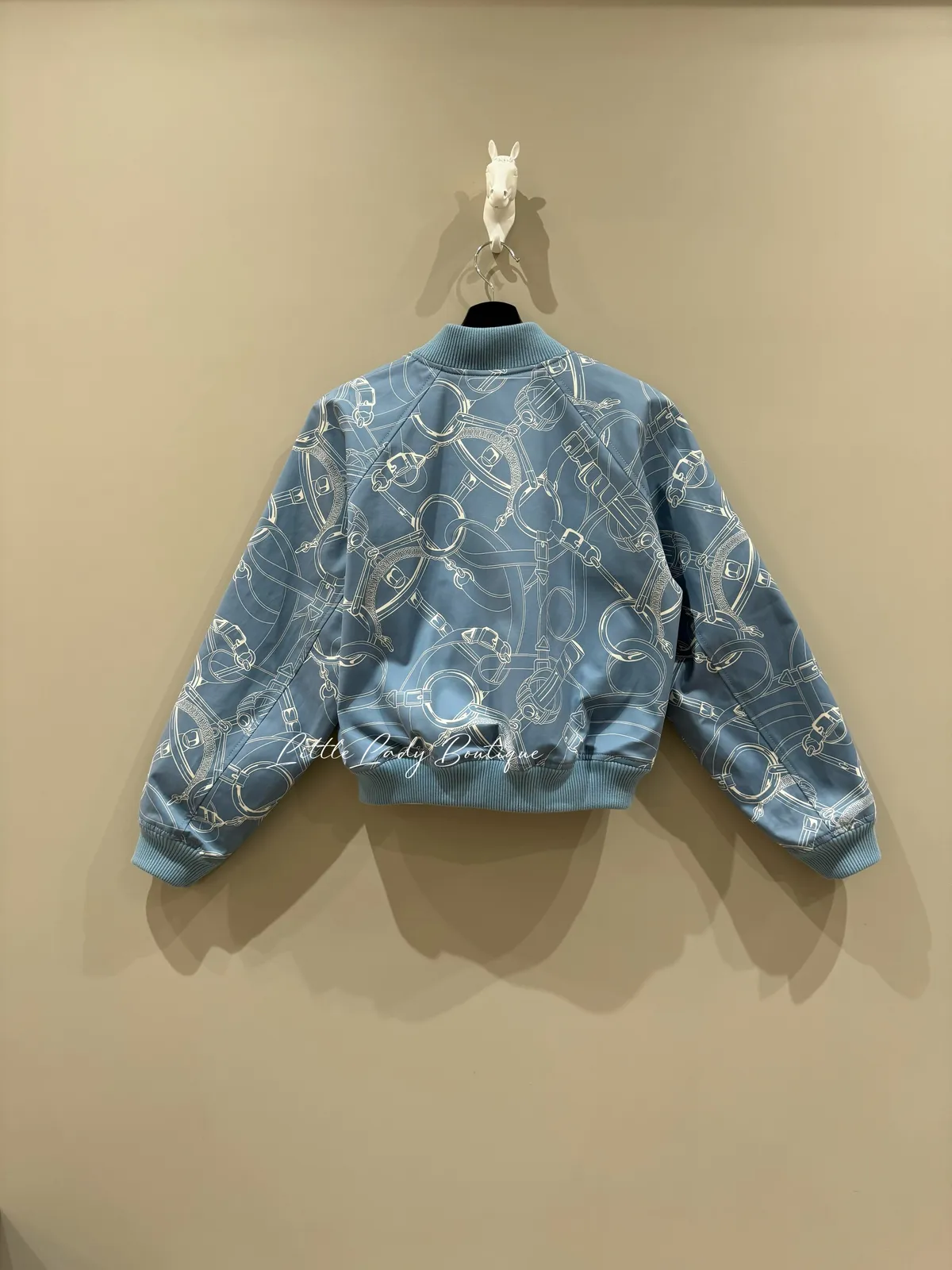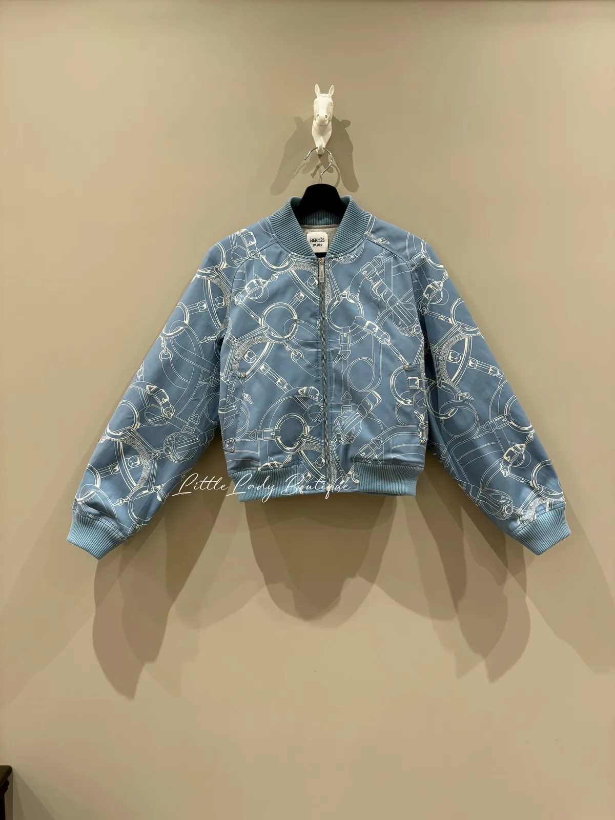 HERMES 女士 北極藍底 白色馬具印花 飛行員夾克外套 (96%棉,4%彈性纖維)(內