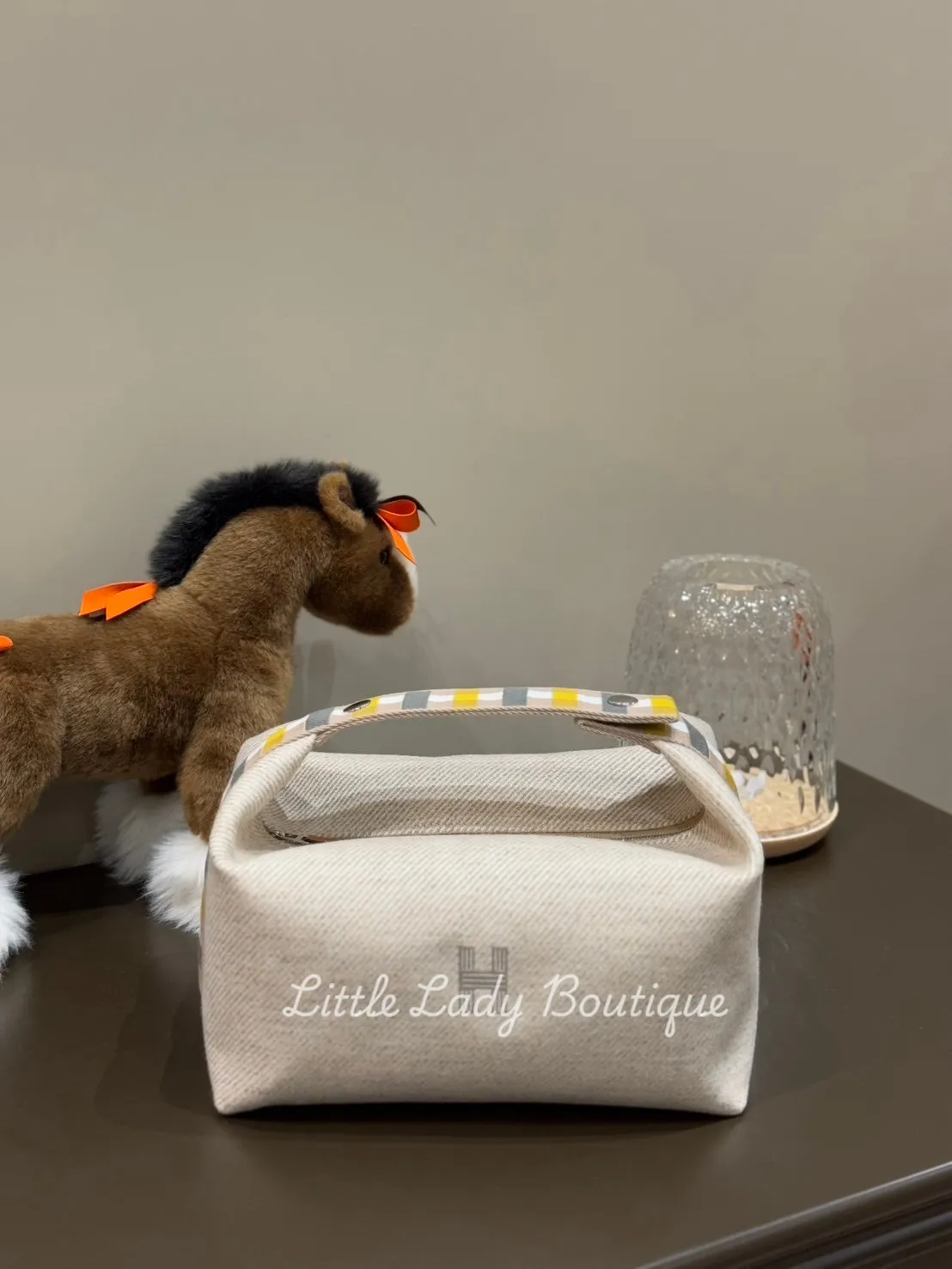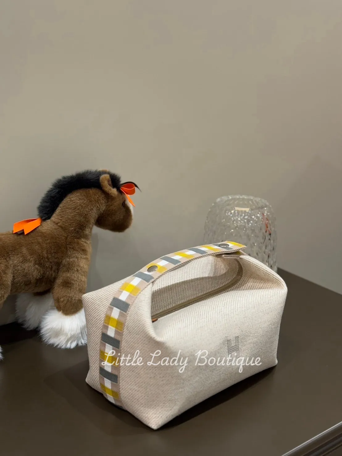 HERMES Bride-a-Brac 刺繡H造型 小麥色 側邊灰黃格 大號 手提化妝包(