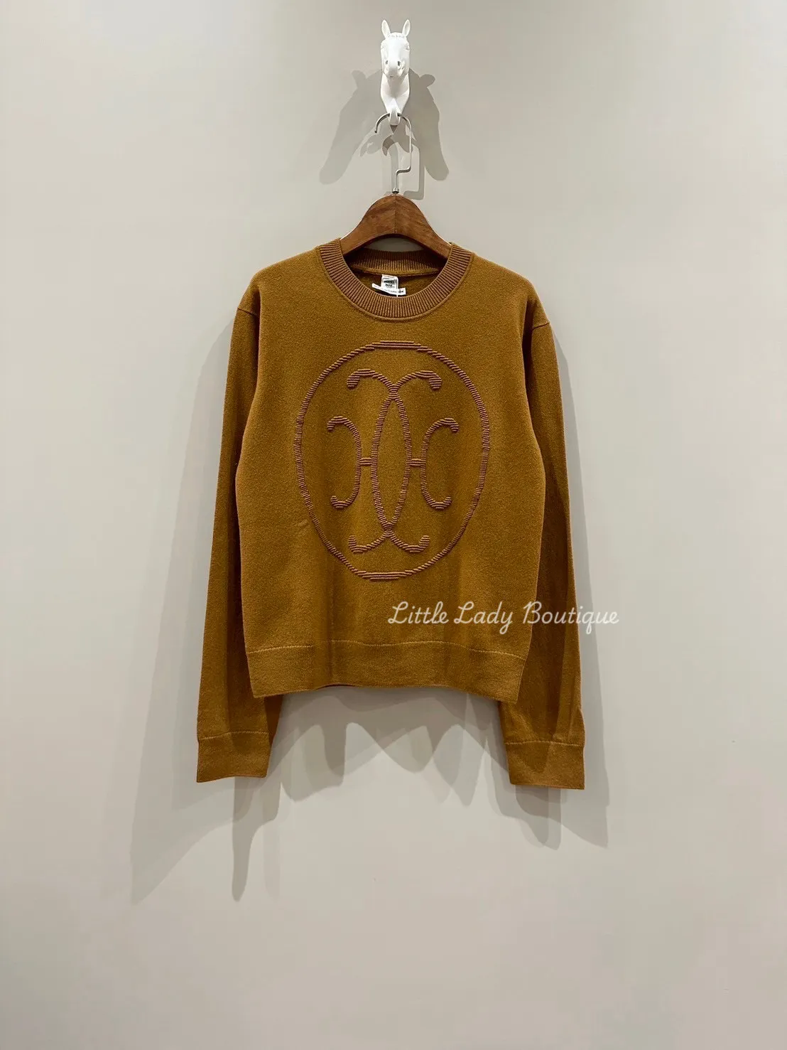 HERMES 女士 中間圓形雙彎H造型 栗子焦糖 圓領長袖針織上衣 (100%CASHEM