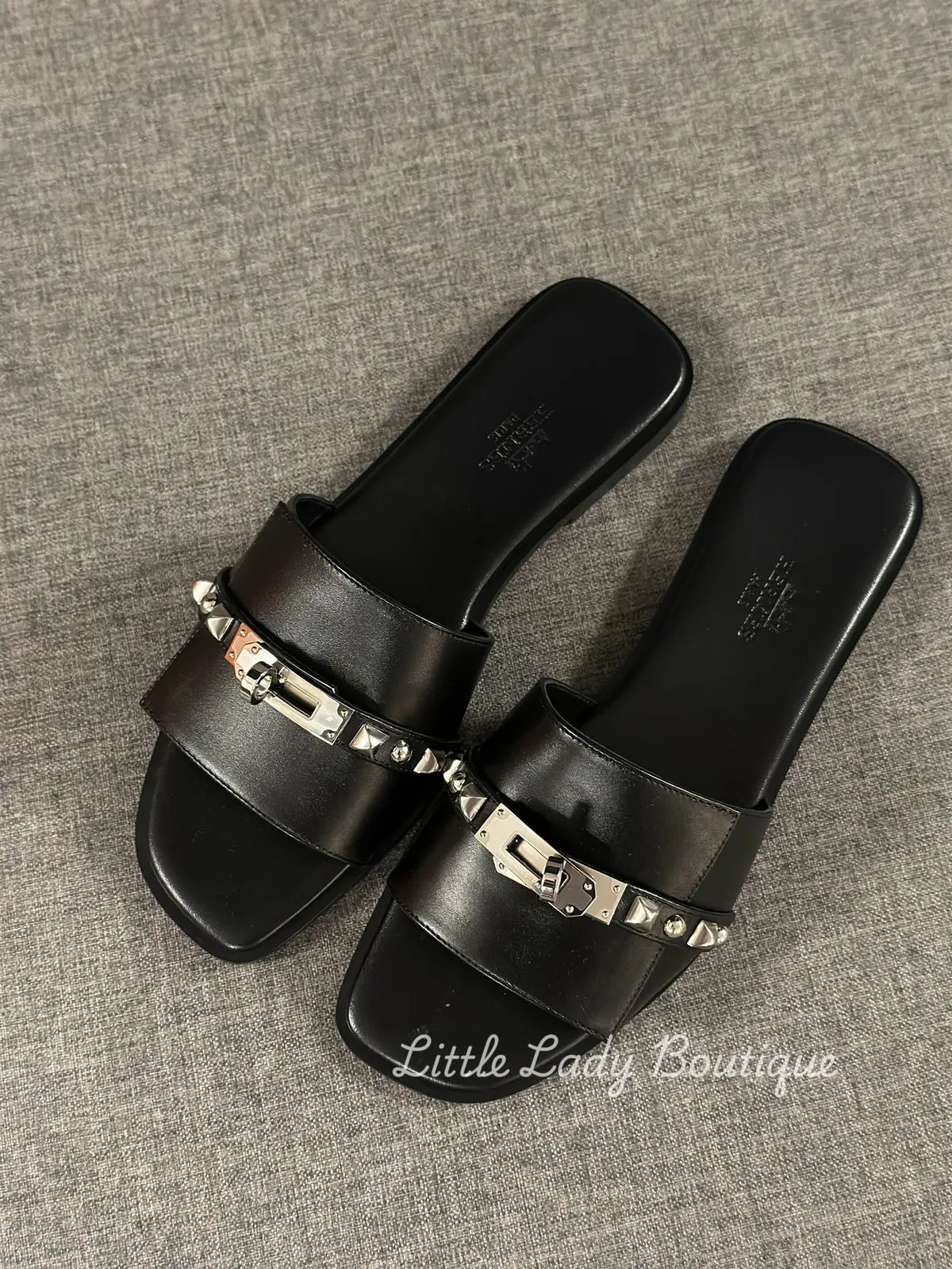 HERMES 女士 Giulia 黑色 銀色凱莉釦&鉚釘 涼拖鞋