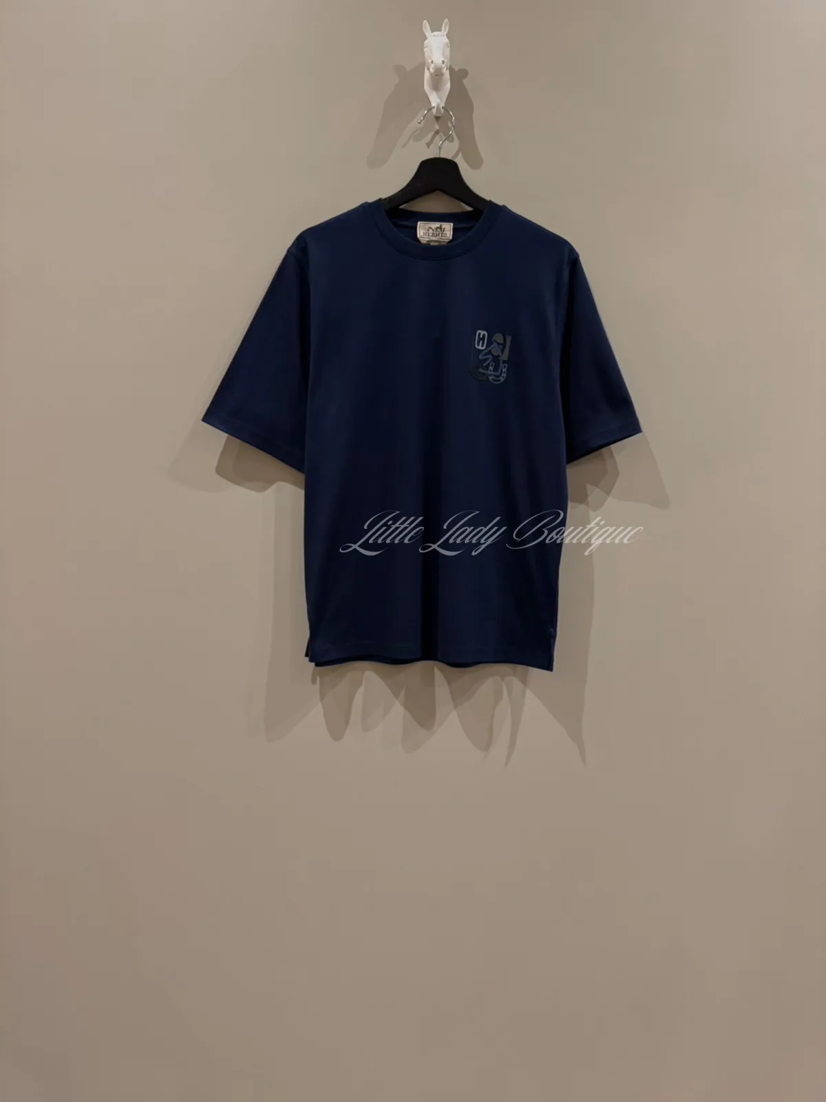 HERMES 男士 海洋深藍底 左胸簍空皮革馬頭豬鼻刺繡馬蹄圖案 短袖上衣(100%棉)