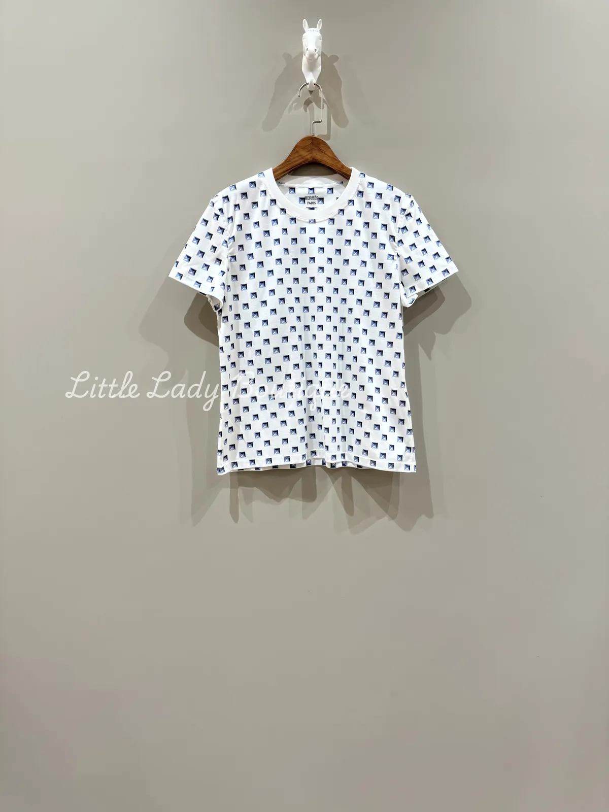 HERMES 女士 白底 Clou Médor Interlock 滿版銀藍色鉚釘 短袖上