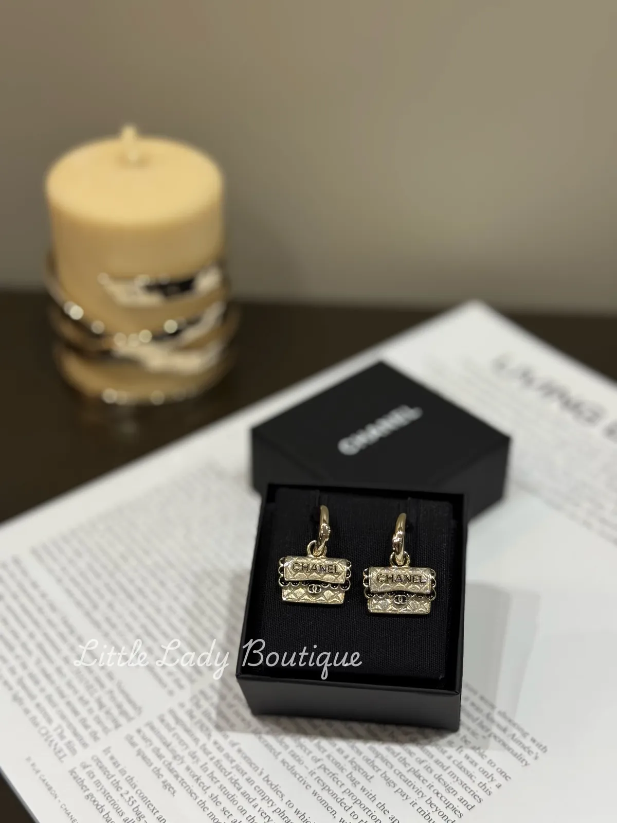 CHANEL 銀色 半圓耳釦 黑花邊銀包包造型 垂吊針式耳環(長3.7CM/包包2*1.3