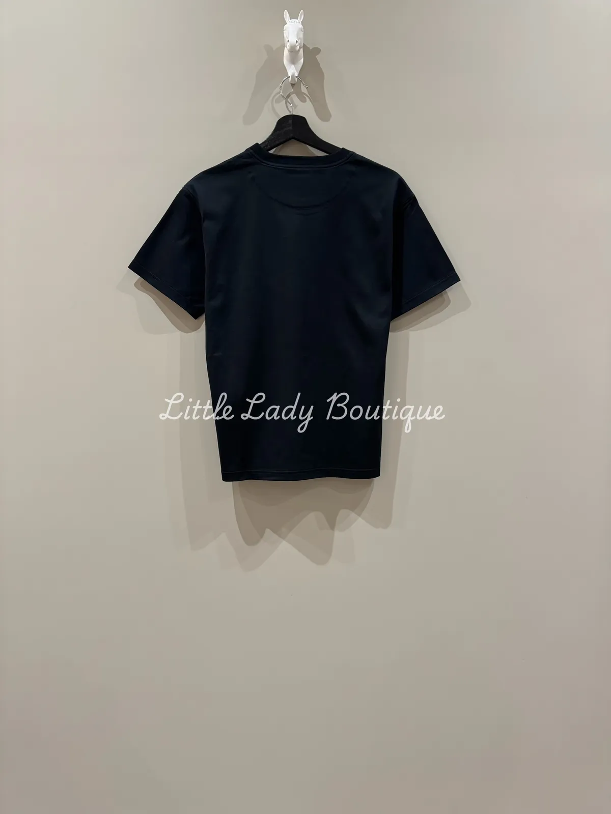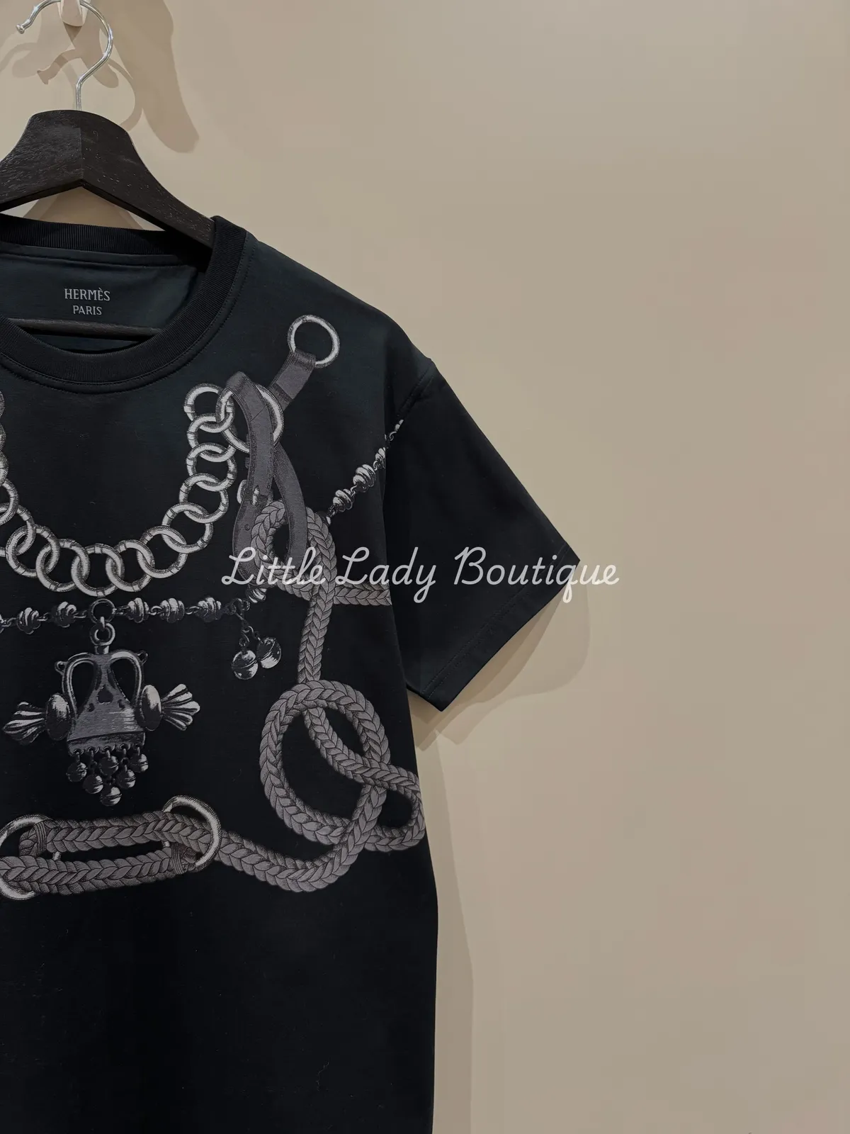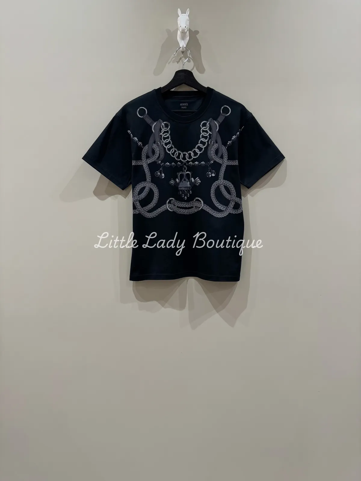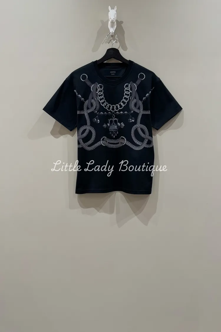 HERMES 女士 Palefroi 黑底 灰色 馬籠頭飾帶圖案 短袖上衣 (100% 純