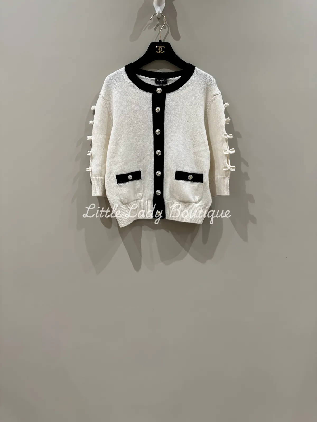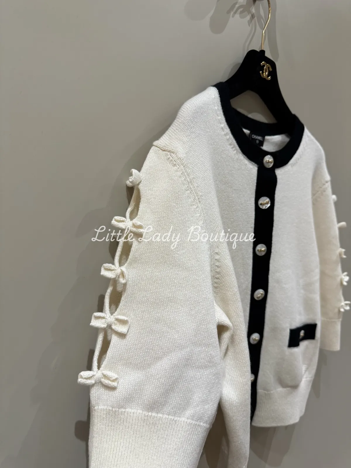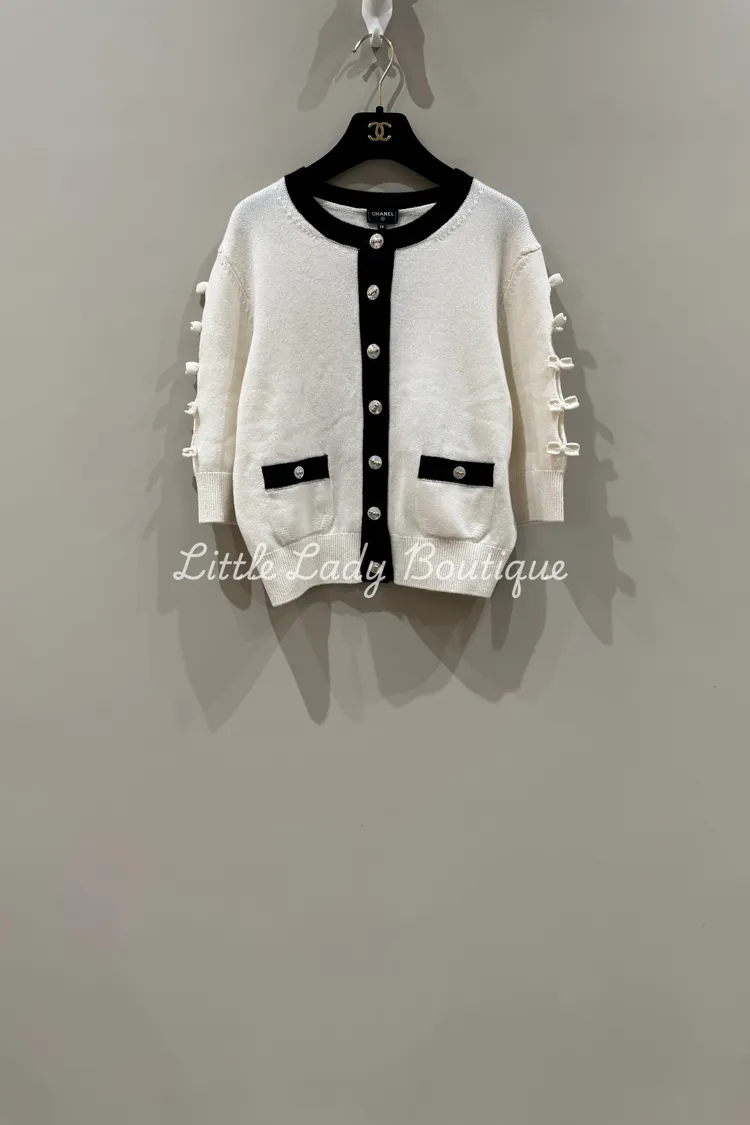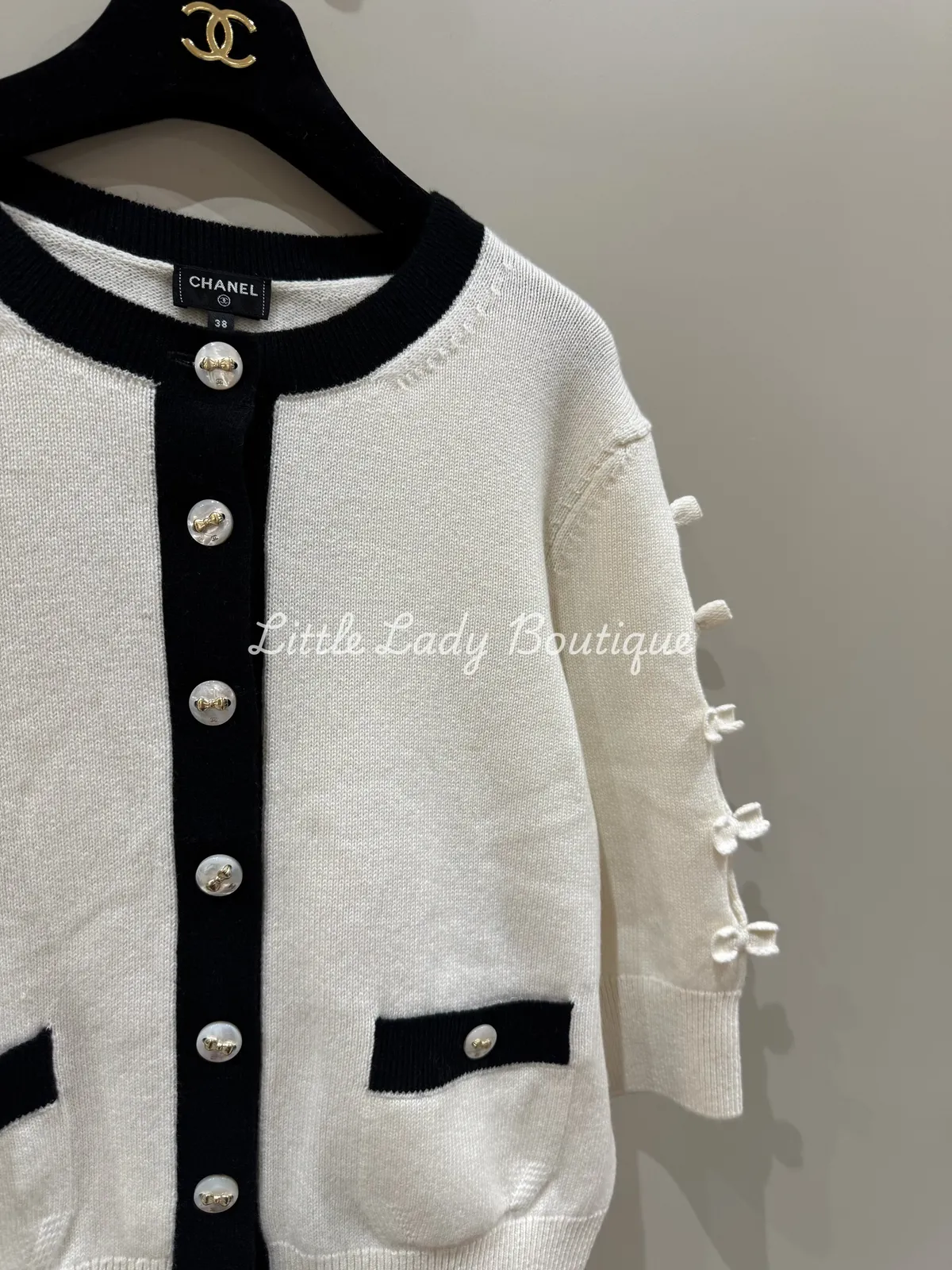 CHANEL 女士 米白底 黑邊 珍珠母貝蝴蝶結鈕釦 雙口袋 蝴蝶簍空5分袖 排釦針織上衣