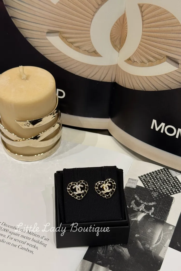 CHANEL 淺金色 皮穿鏈愛心造型 中間鑲鑽雙C 貼耳針式耳環(約2*2CM)