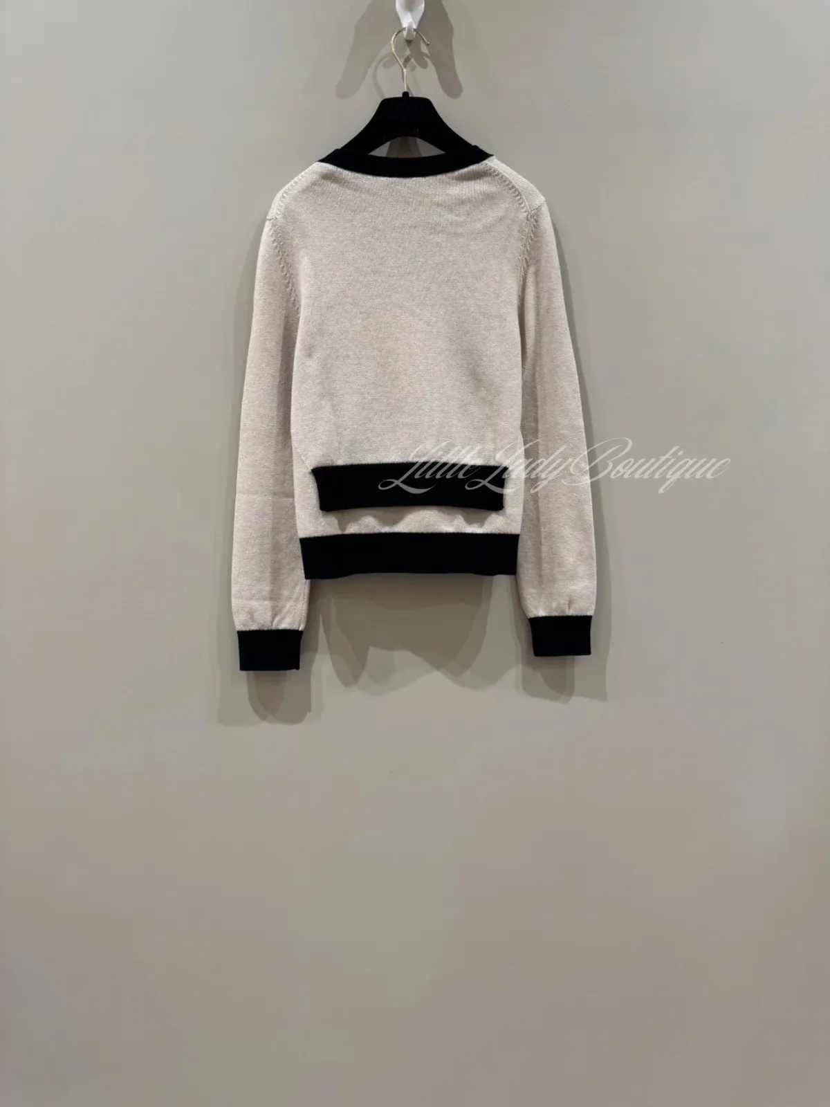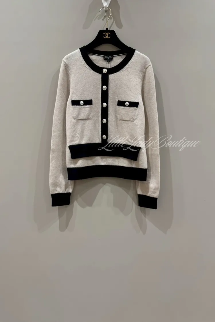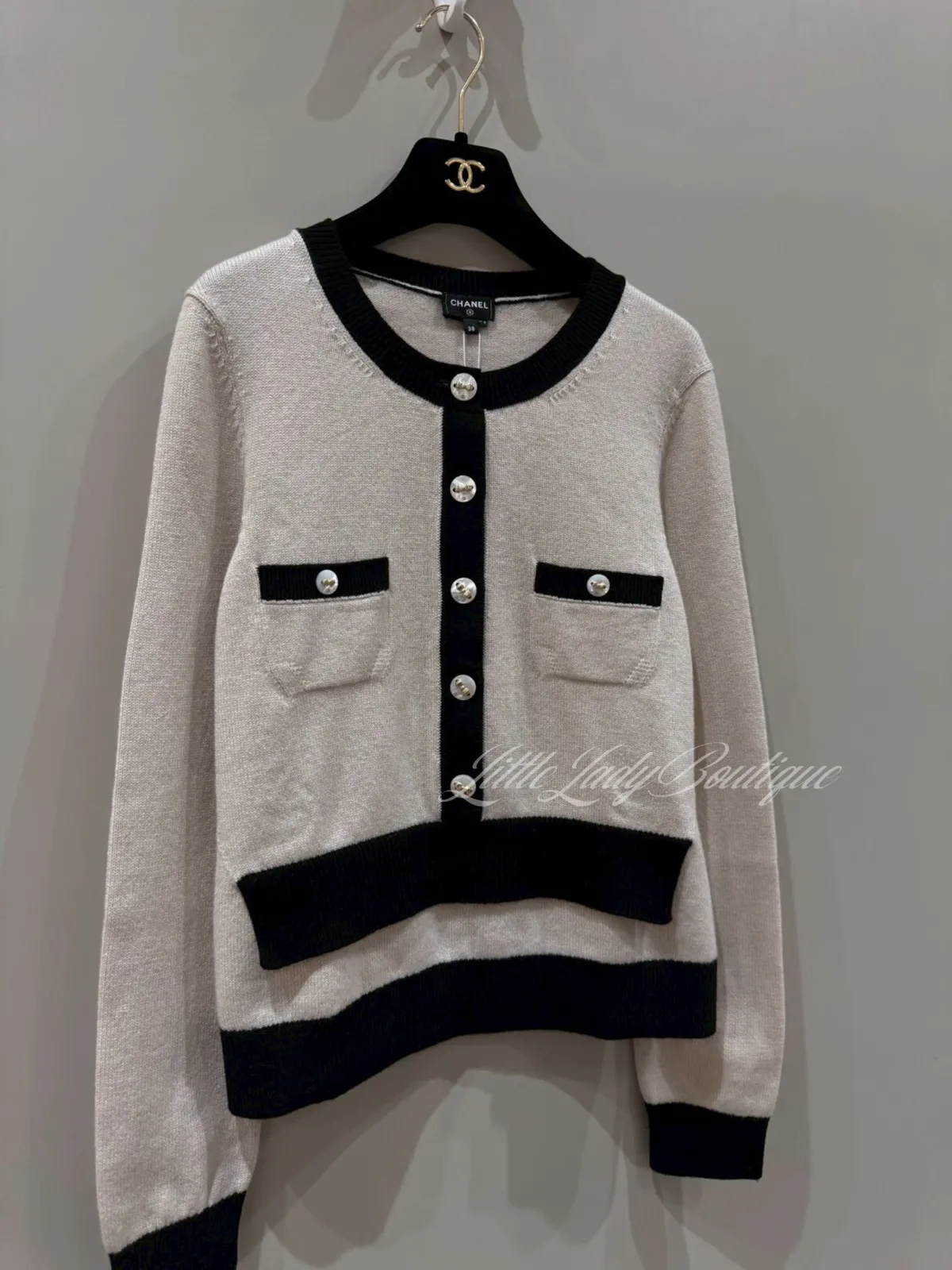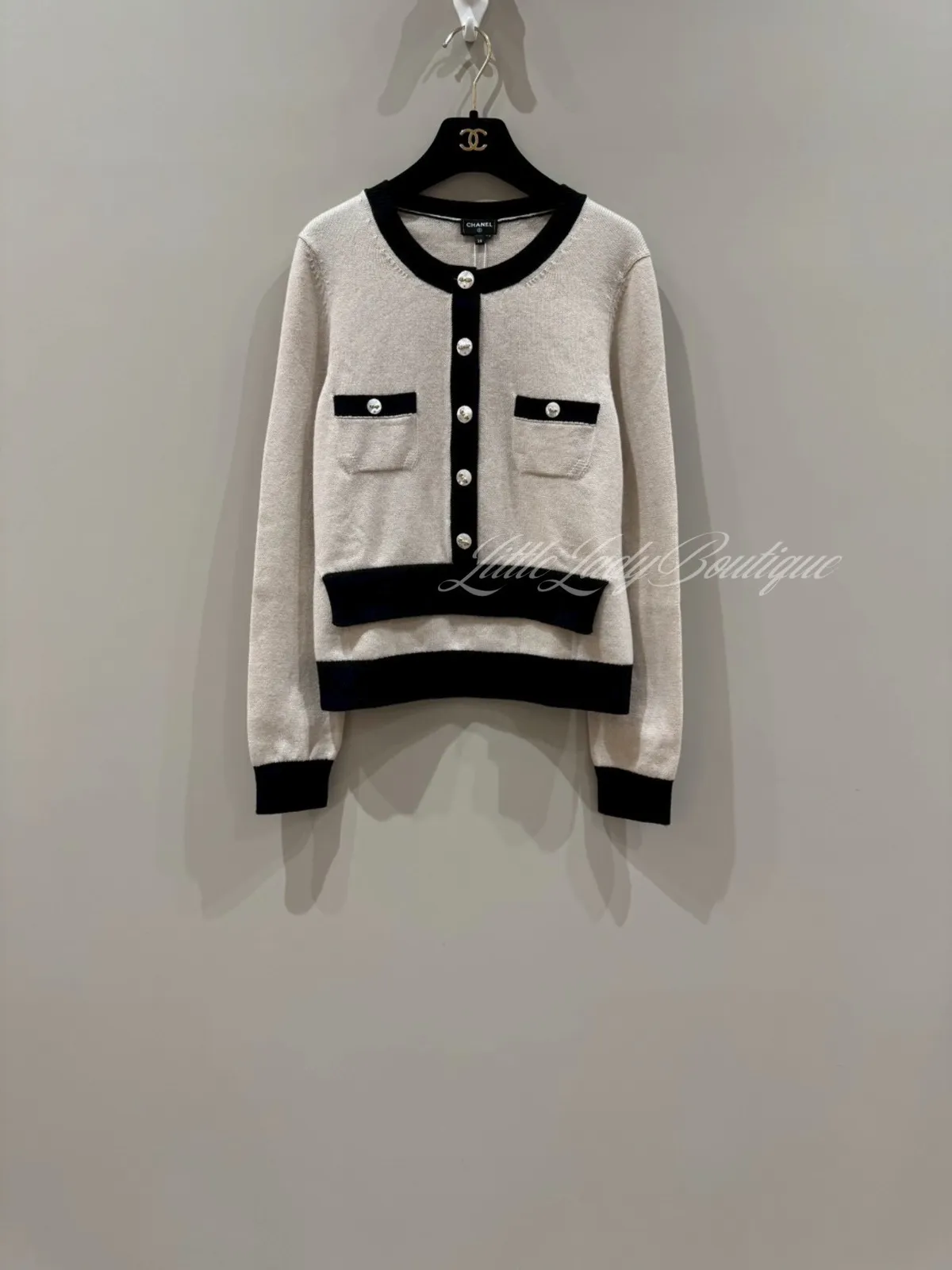 CHANEL 女士 燕麥米底 黑邊 珍珠母貝蝴蝶結鈕釦 胸前雙口袋 排釦針織上衣(98%C