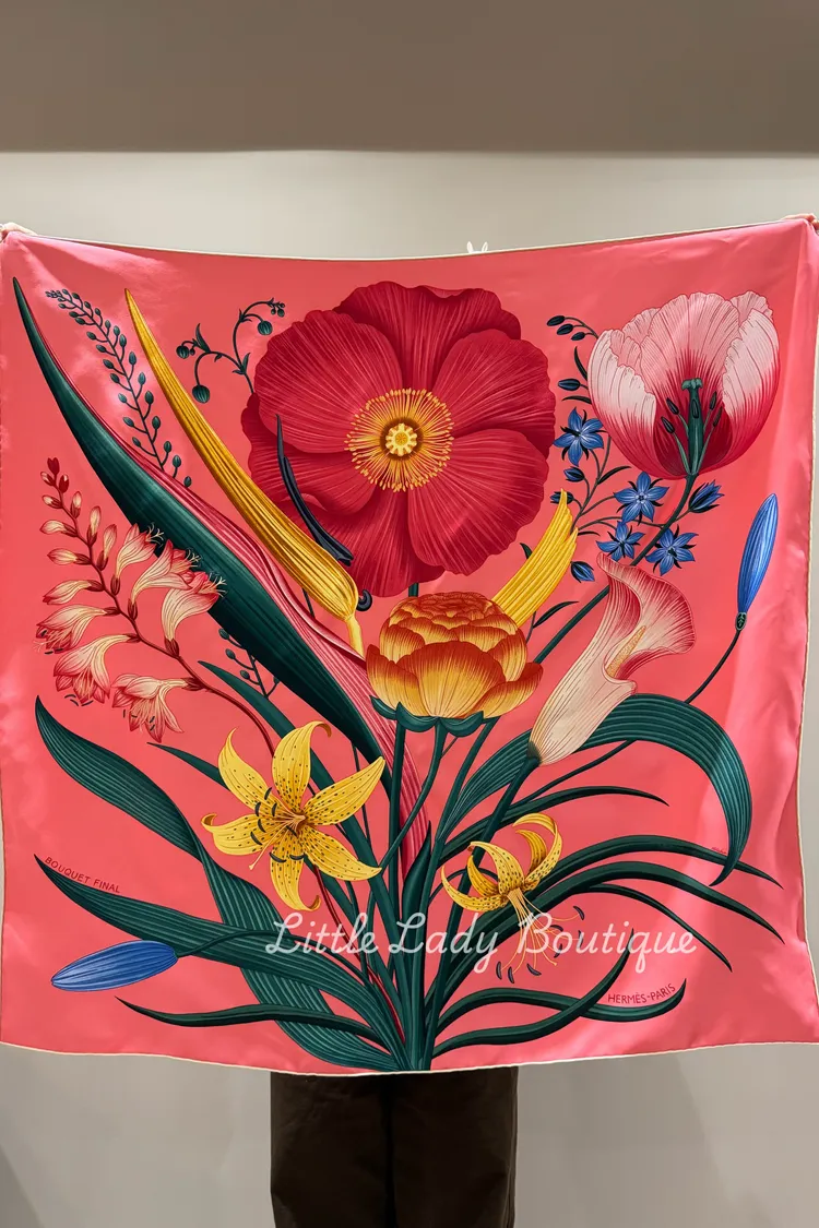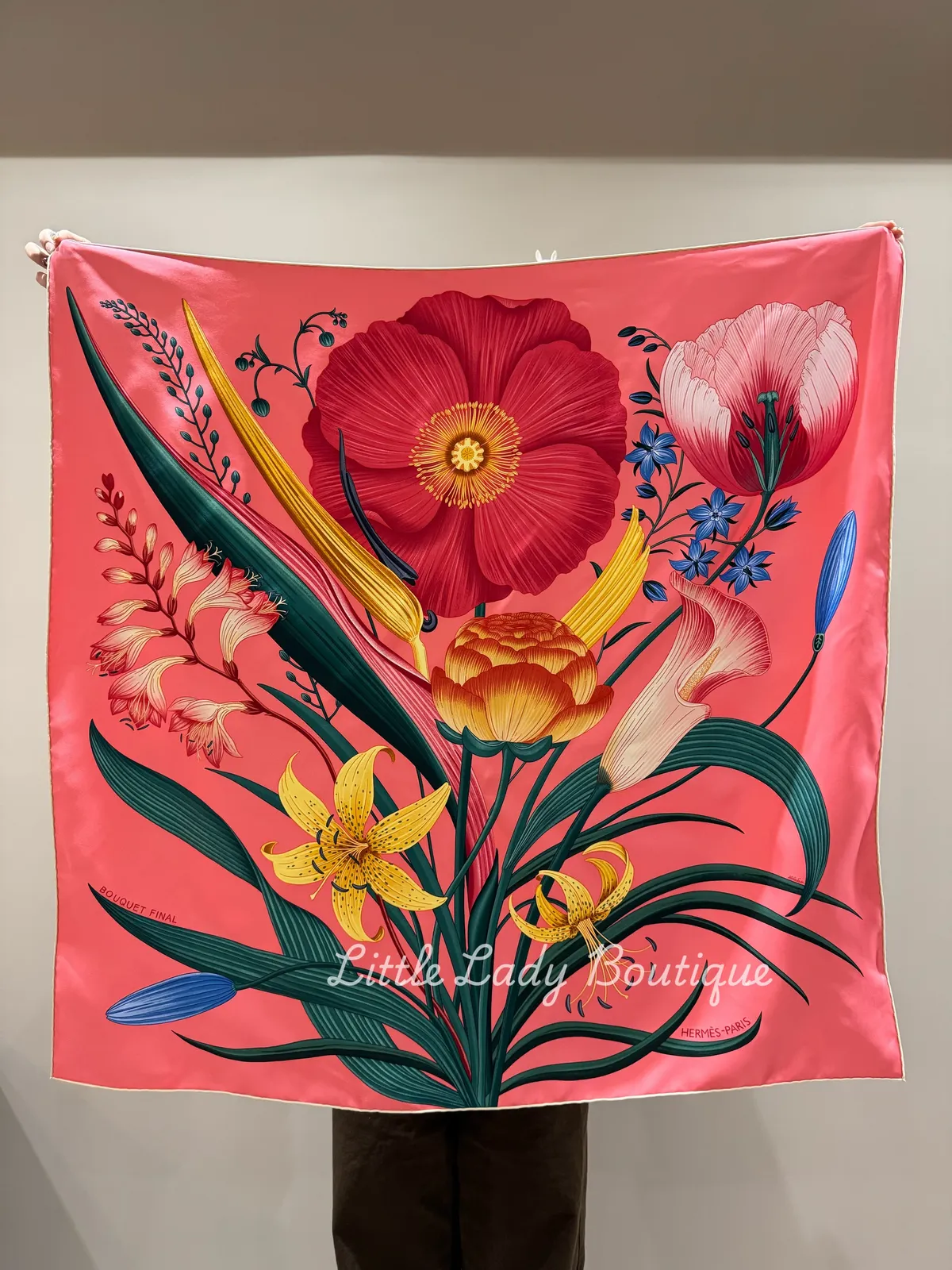 HERMES 90*90 絲巾 花束終章 (玫瑰色 / 翠柏 / 黃) 鬱金香.勿忘我.百