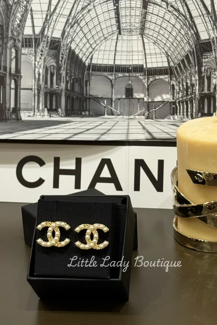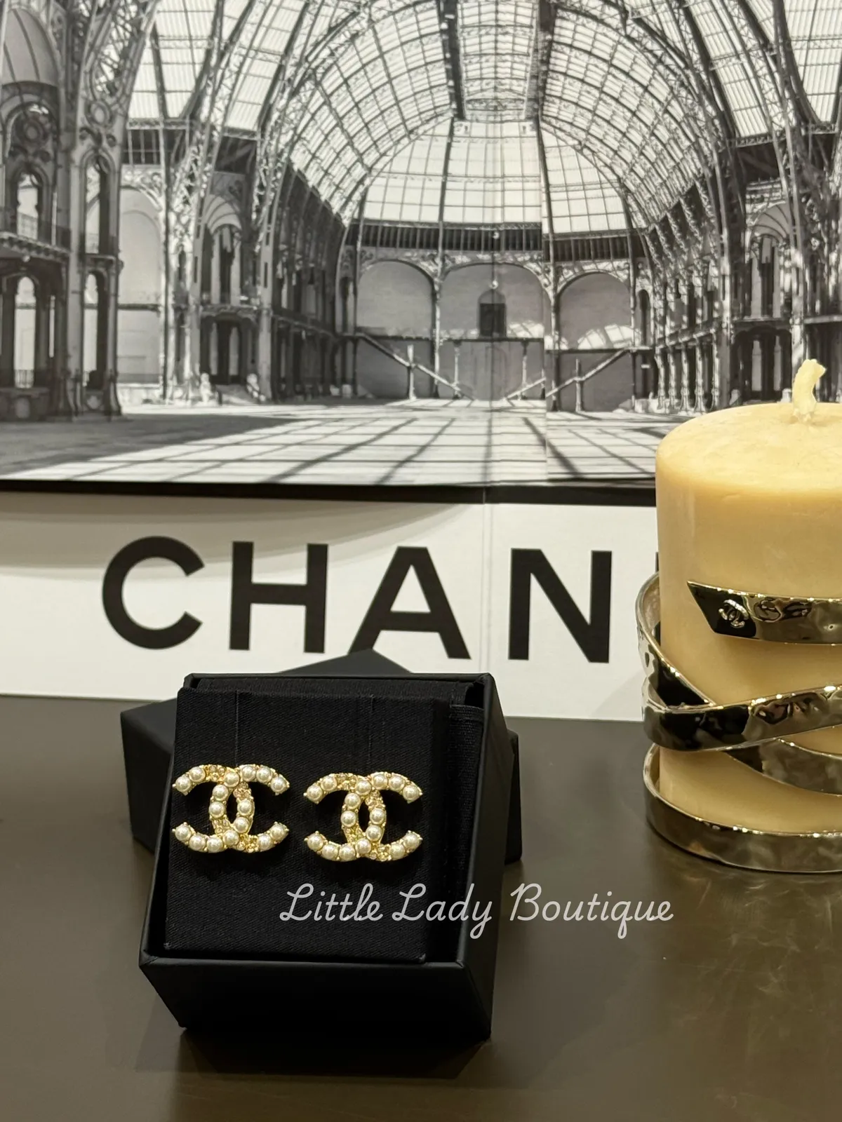 CHANEL 金邊 珍珠&鑽 雙C 貼耳式耳針耳環 (約2.5*2CM)