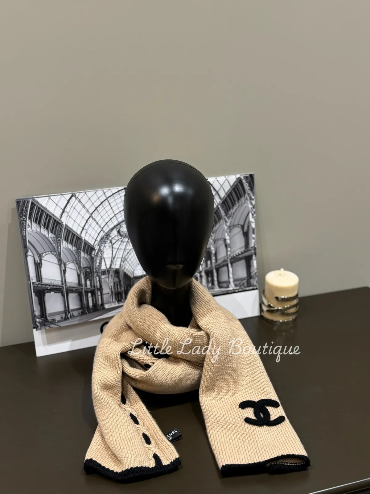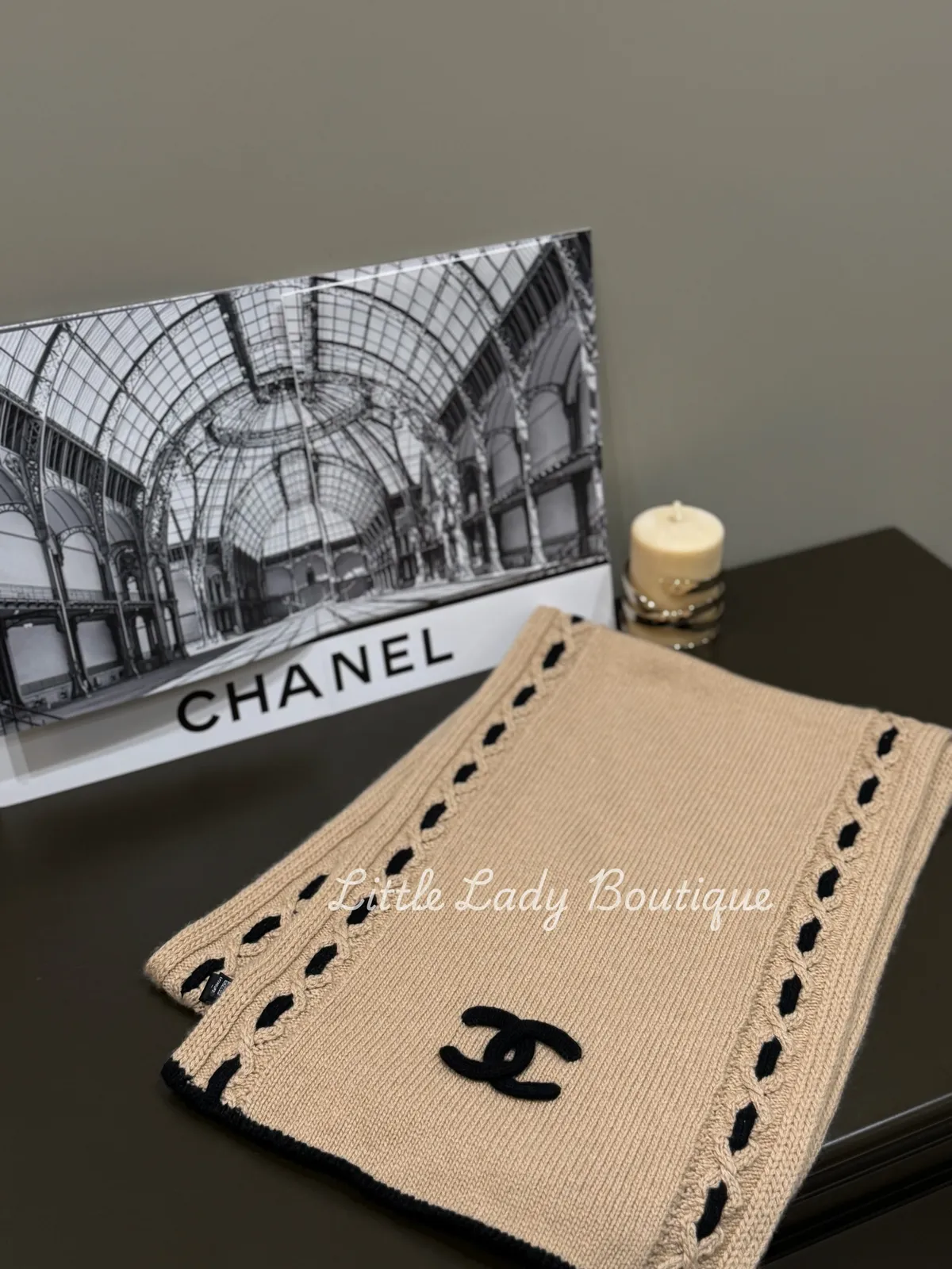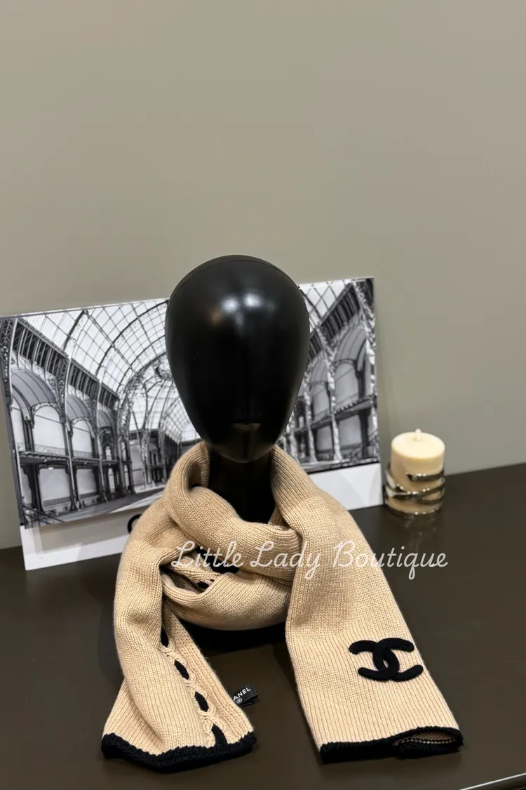 CHANEL 駝底黑邊黑雙C 長型圍巾(190*30CM)(100%CASHMERE)