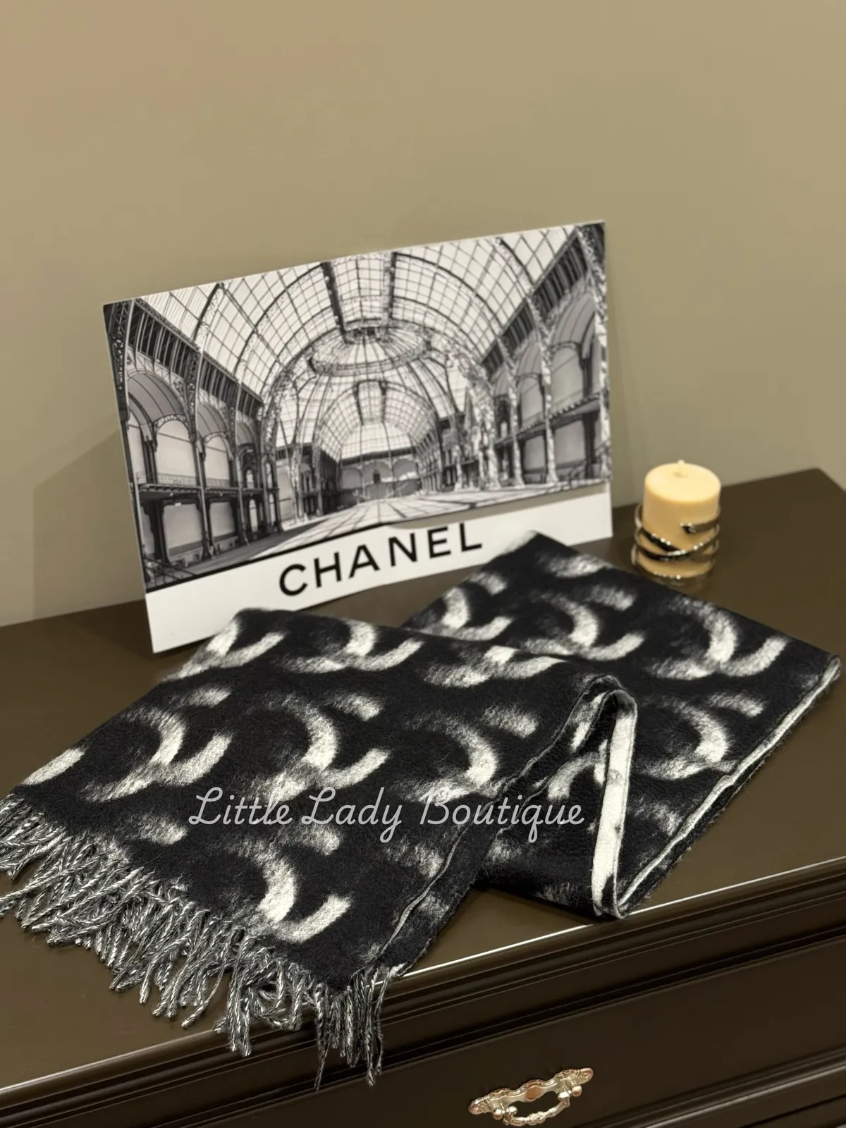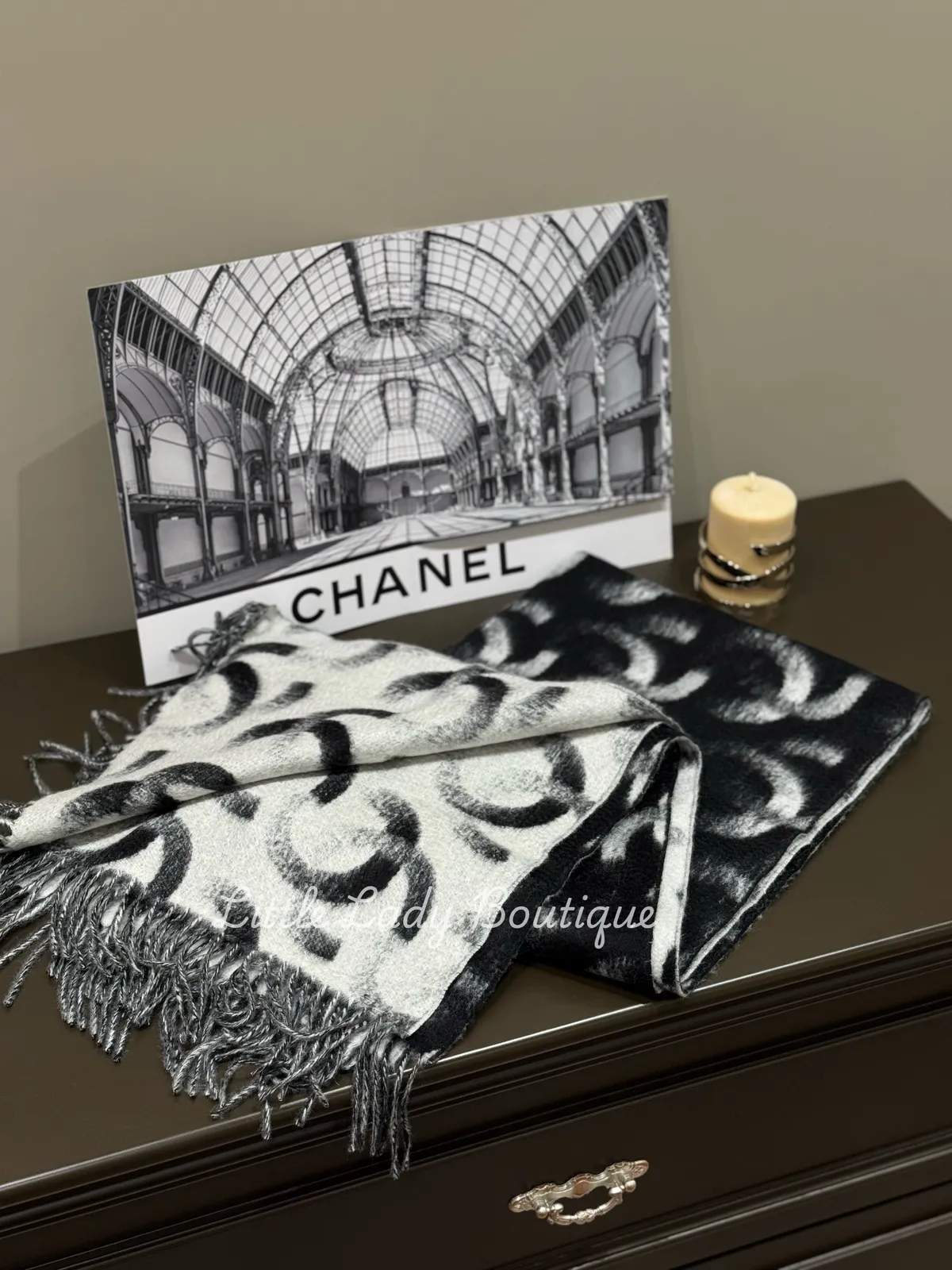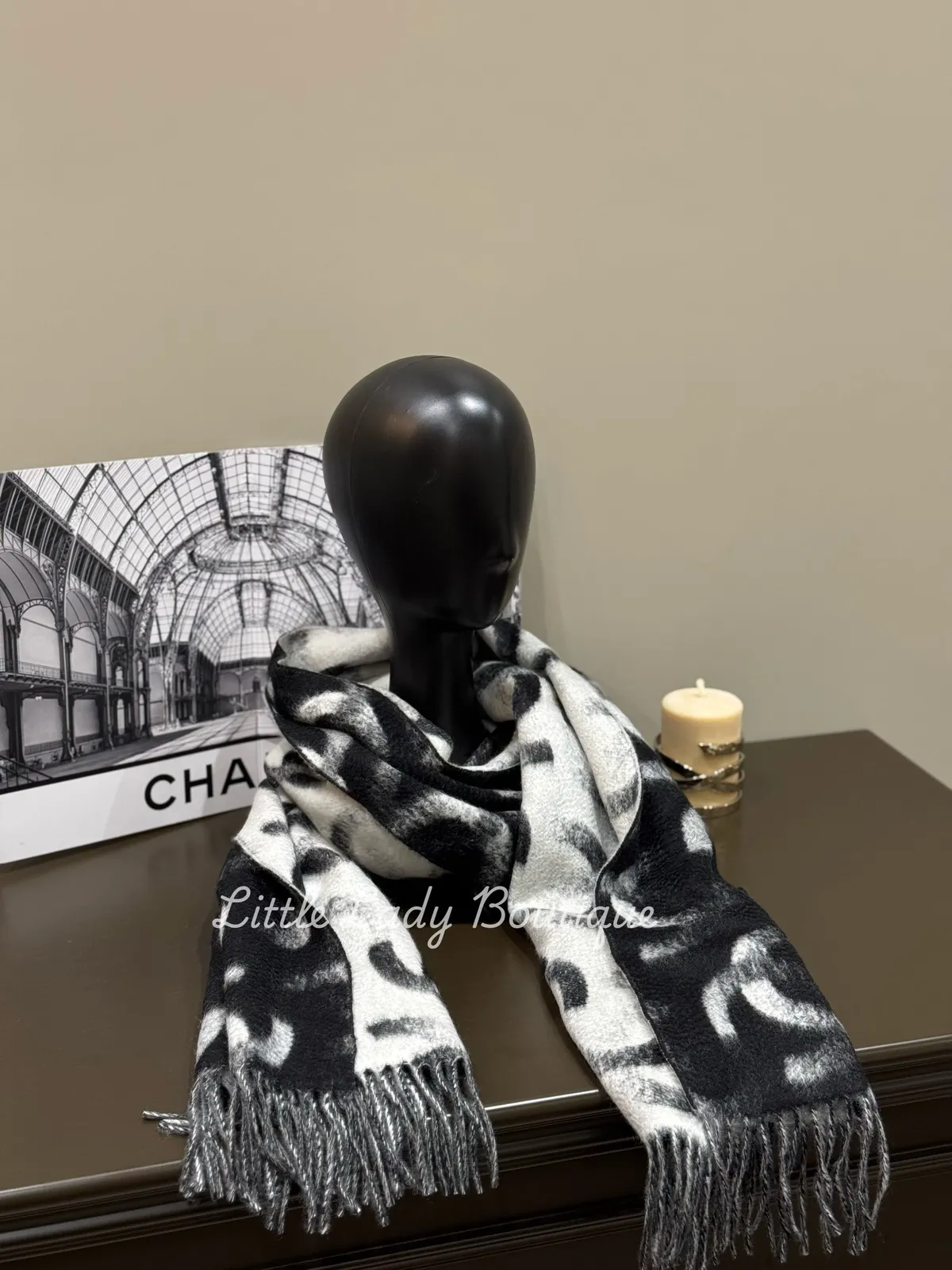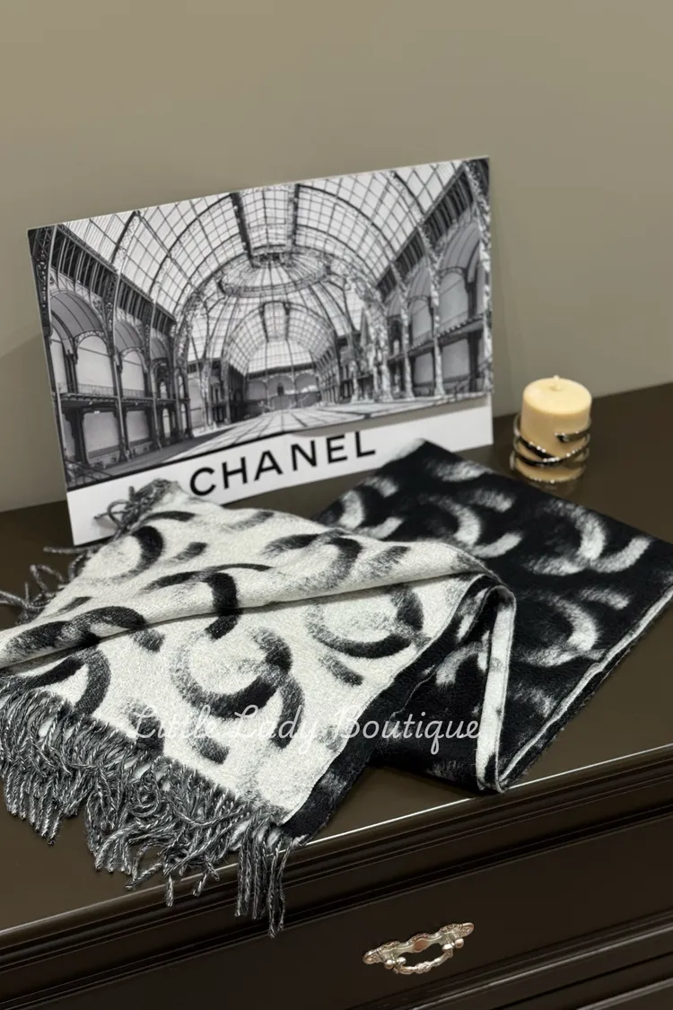 CHANEL 黑/白 雙C字 漸層感 長型流蘇圍巾