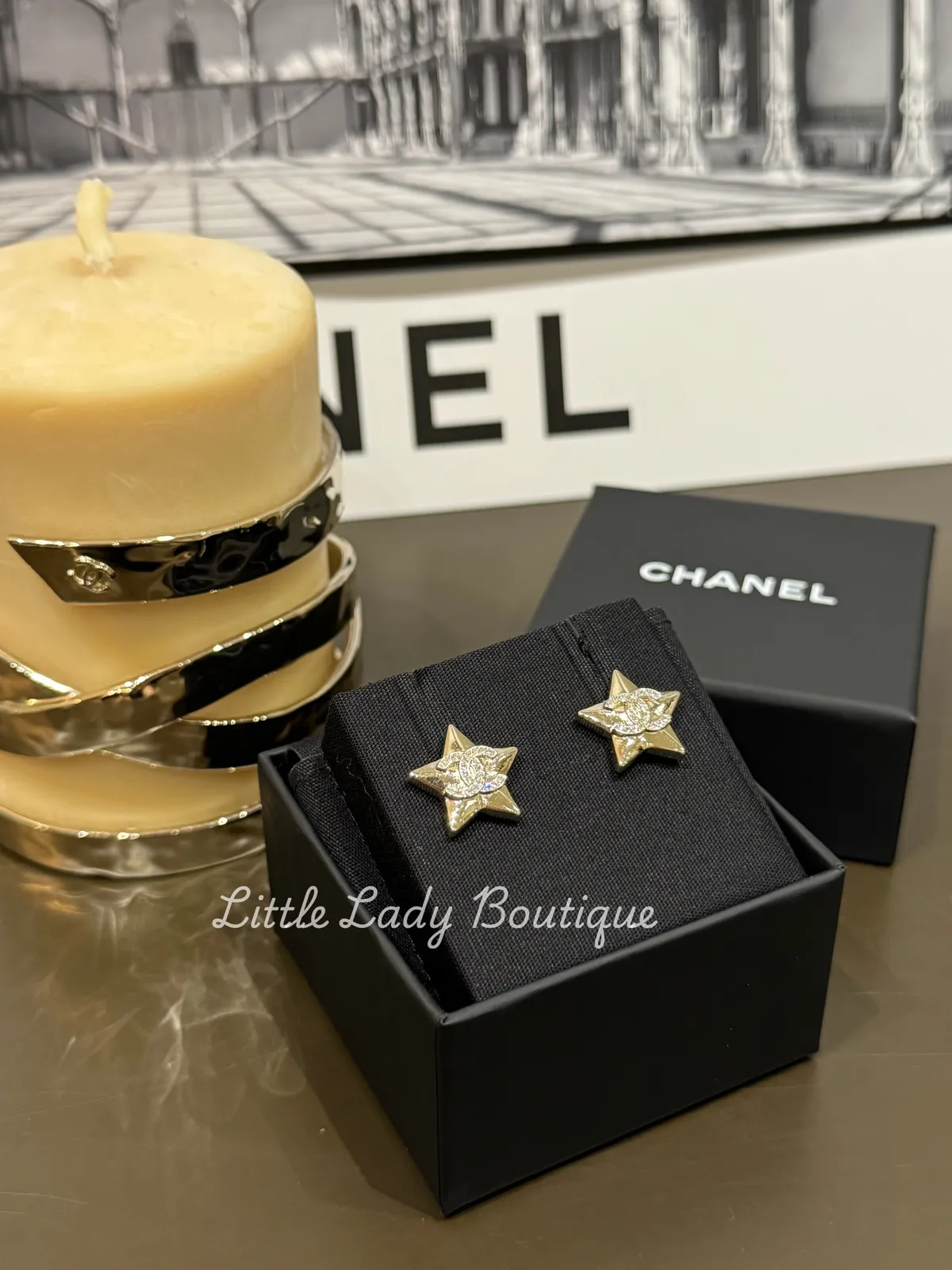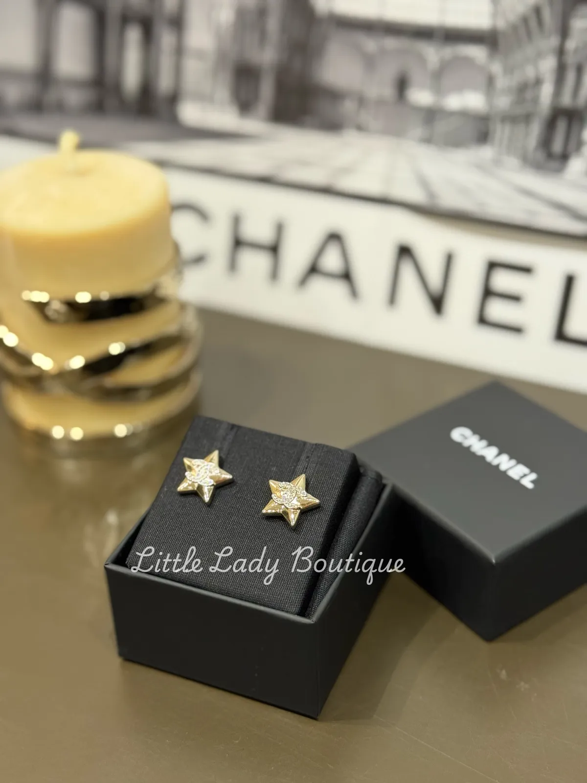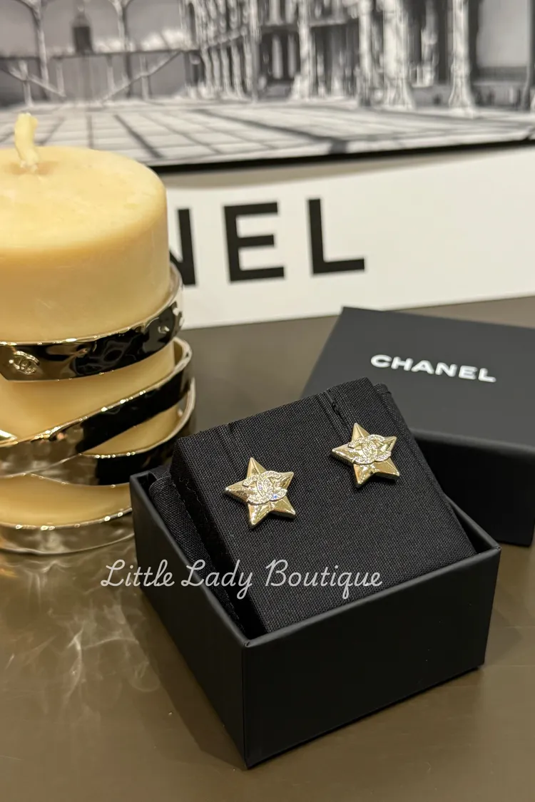 CHANEL 淺金色 雙C鑽 星星型 貼耳針式耳環