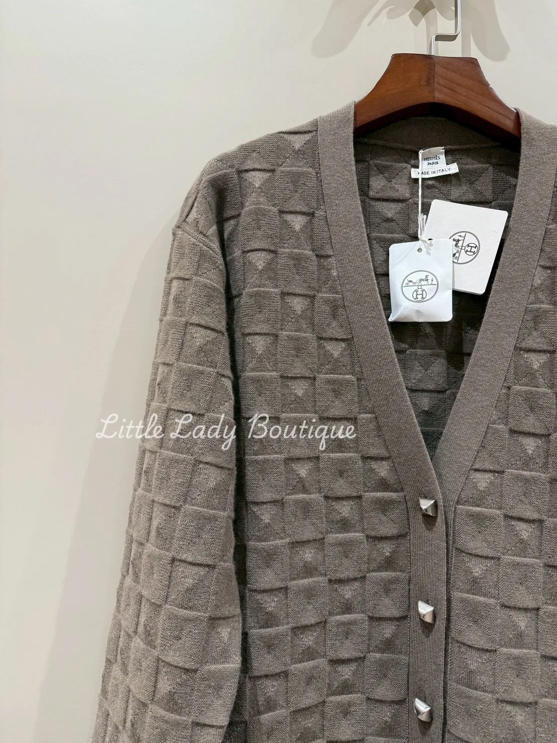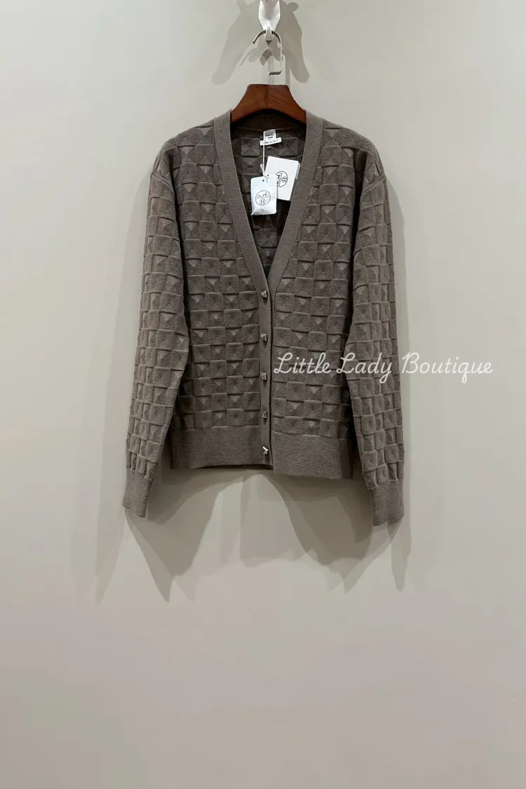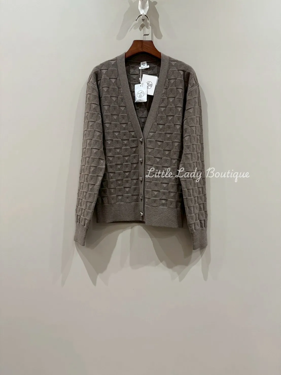 HERMES 女士 大象灰 滿版凸起Medor鉚釘圖案 V領 銀色鉚釘鈕釦 針織開襟外套
