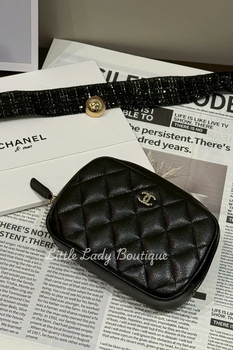 CHANEL 金釦 黑色 菱格紋荔枝皮 拉鍊化妝包(16*11*4cm)