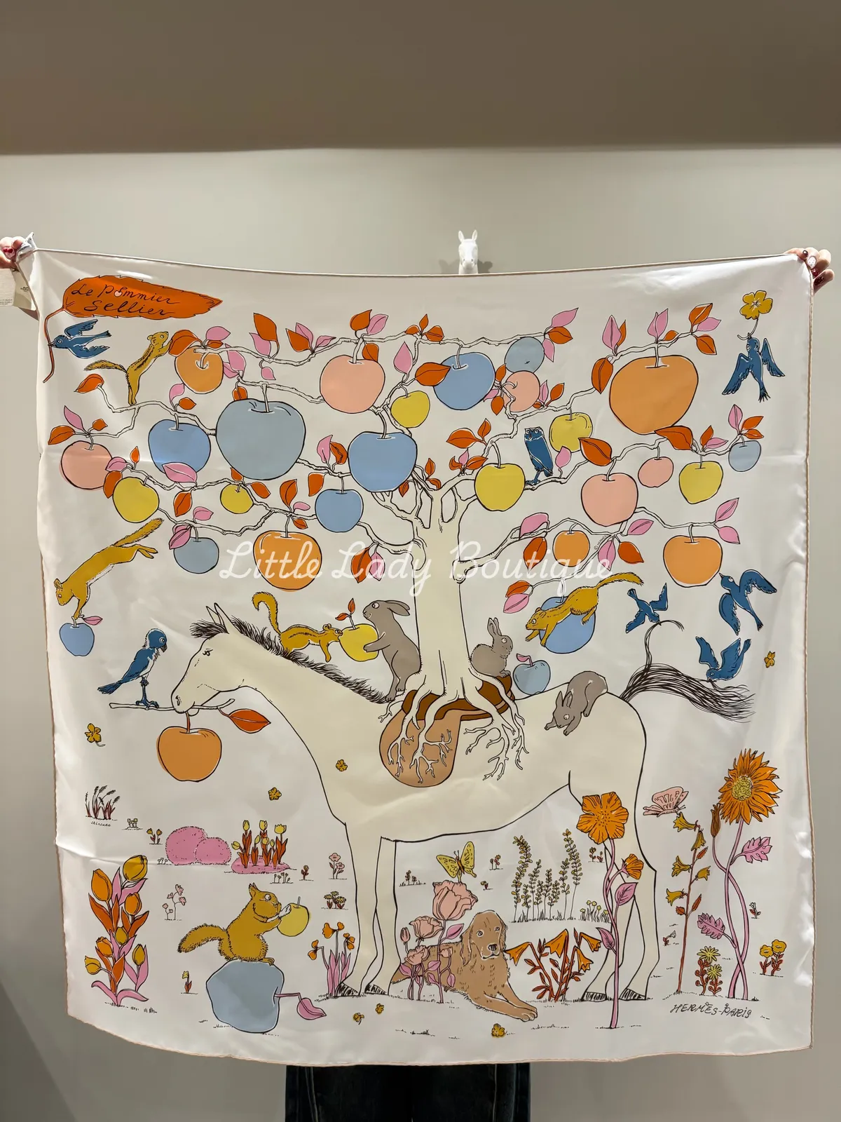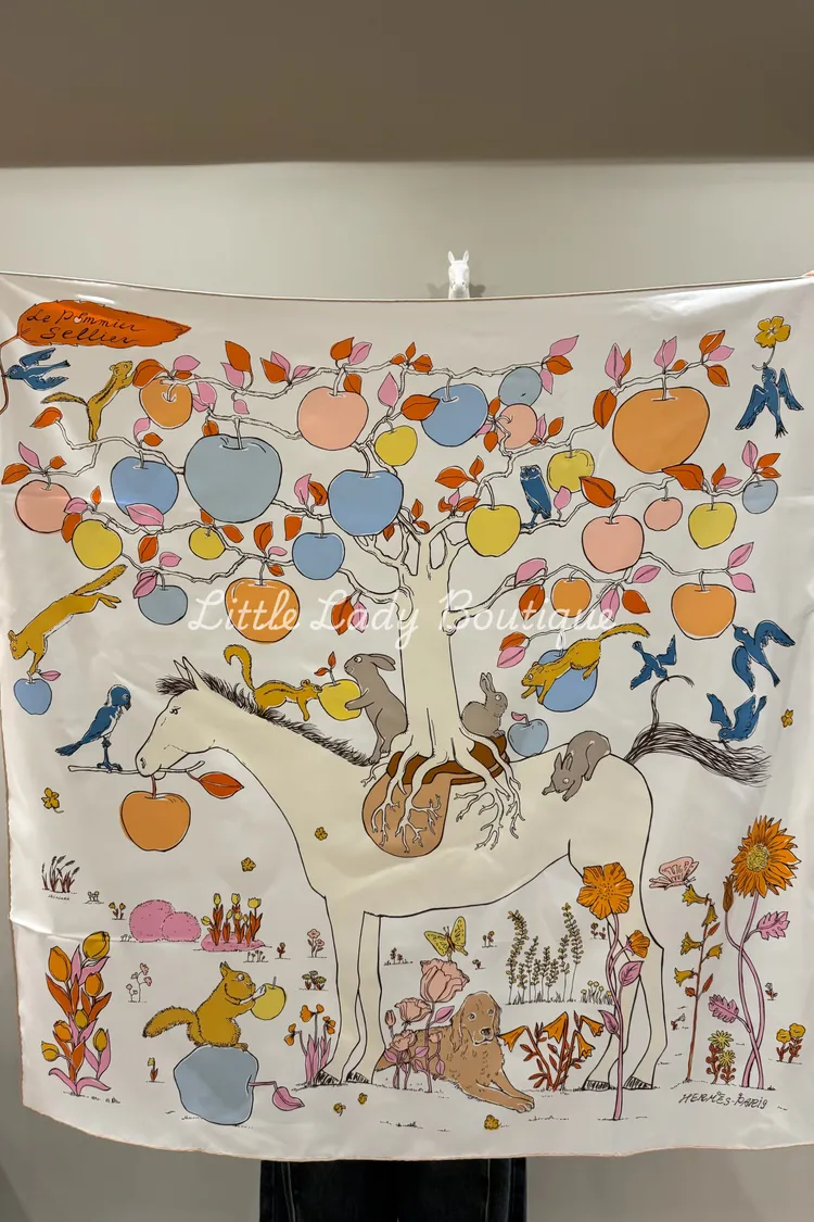 HERMES 90*90 絲巾 馬鞍上的蘋果樹(白 / 藍色冰川 / 淺橘杏)