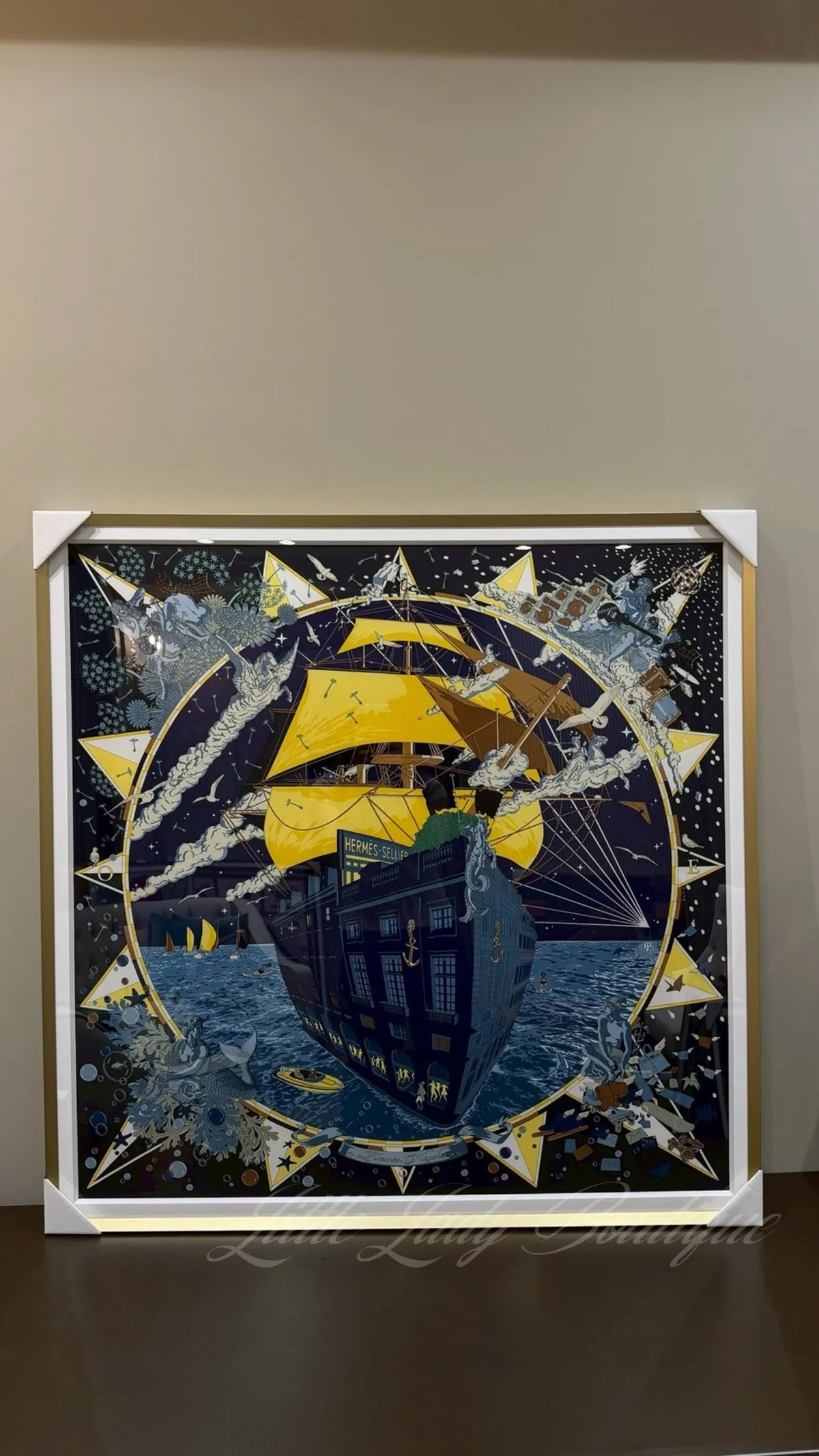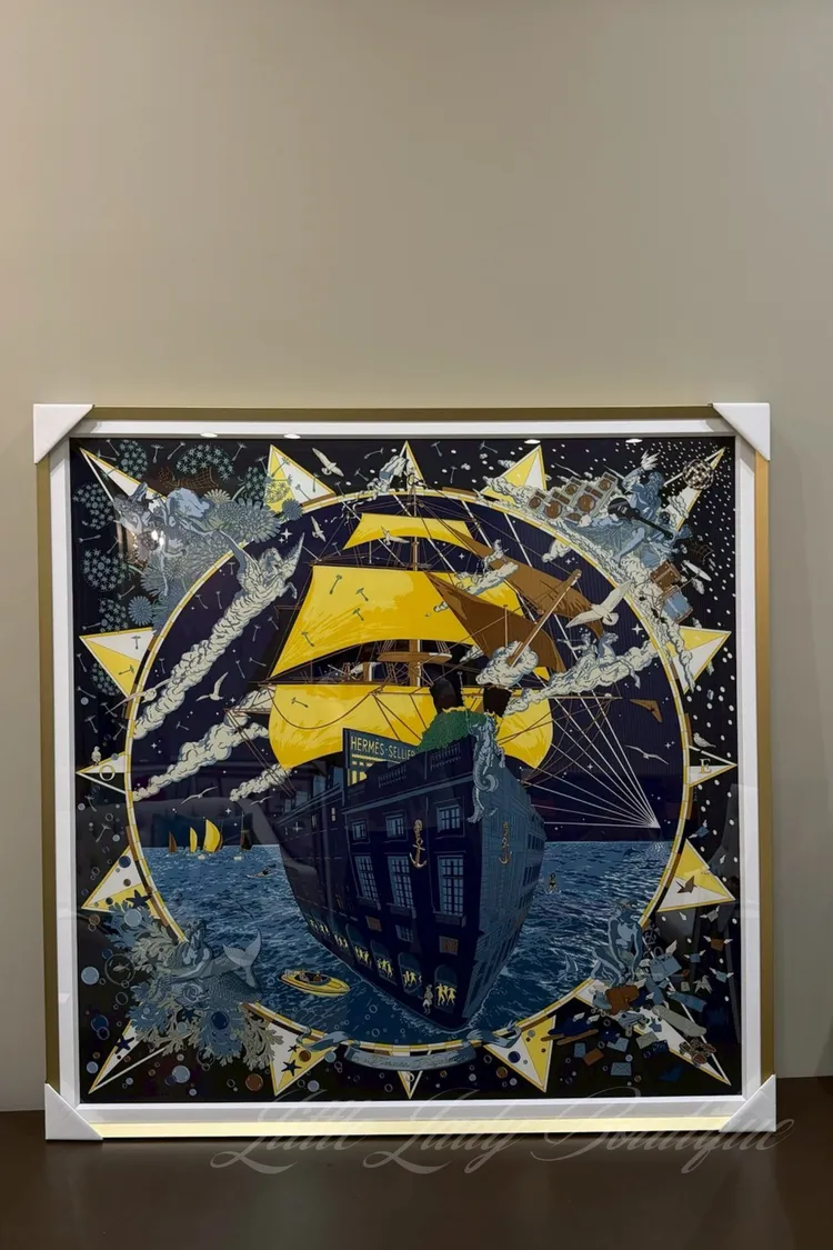 (含框)HERMES 90*90 絲巾 福寶郵輪 (深海軍藍 / 黃色 / 牛仔藍)
