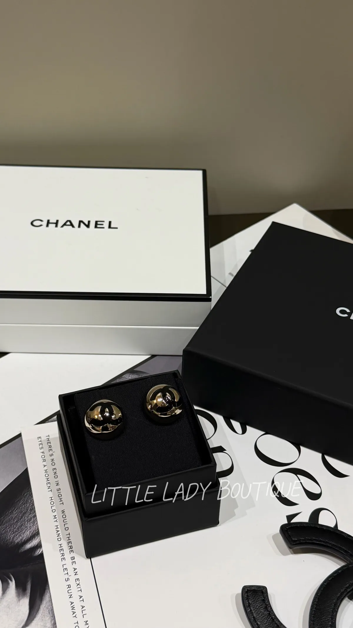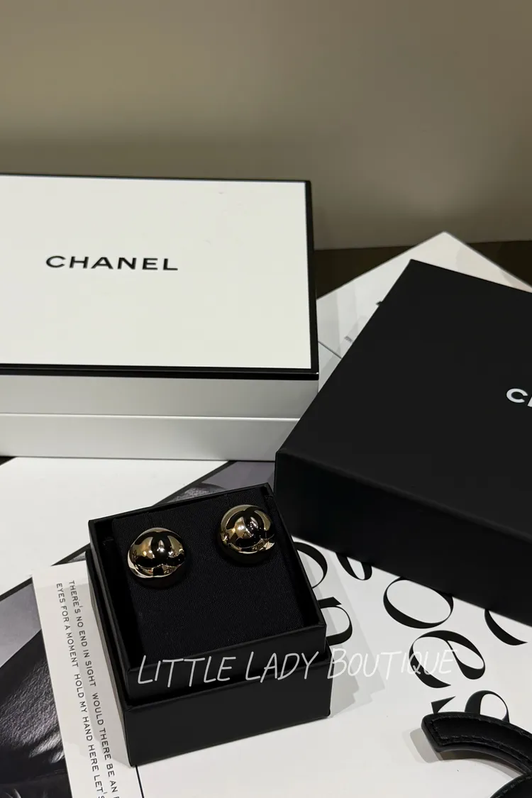 Chanel 金色大半圓 黑色雙C Logo 貼耳針式耳環 (2*2CM)